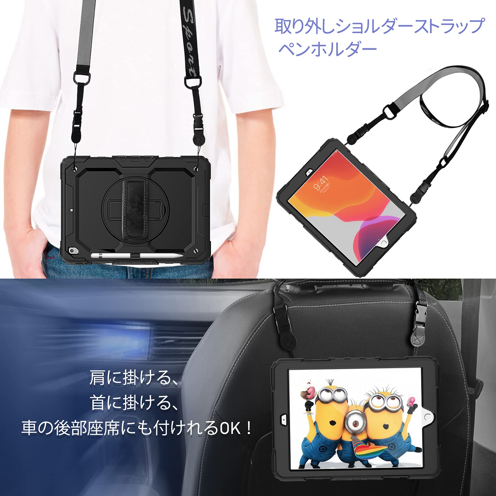 Timecity iPad 10.2 ケース 耐衝撃 iPad 第9世代/第8世代/第7世代 ケース 保護フィルム内蔵 360度回転スタンド ペン収納 肩紐 ハンドストラップ付き 頑丈 傷防止 肩掛け 多機能 iPad 10.2インチ 全面保護カバー 2021/2020/2019 (ブラック)(適格請求書発行可能)