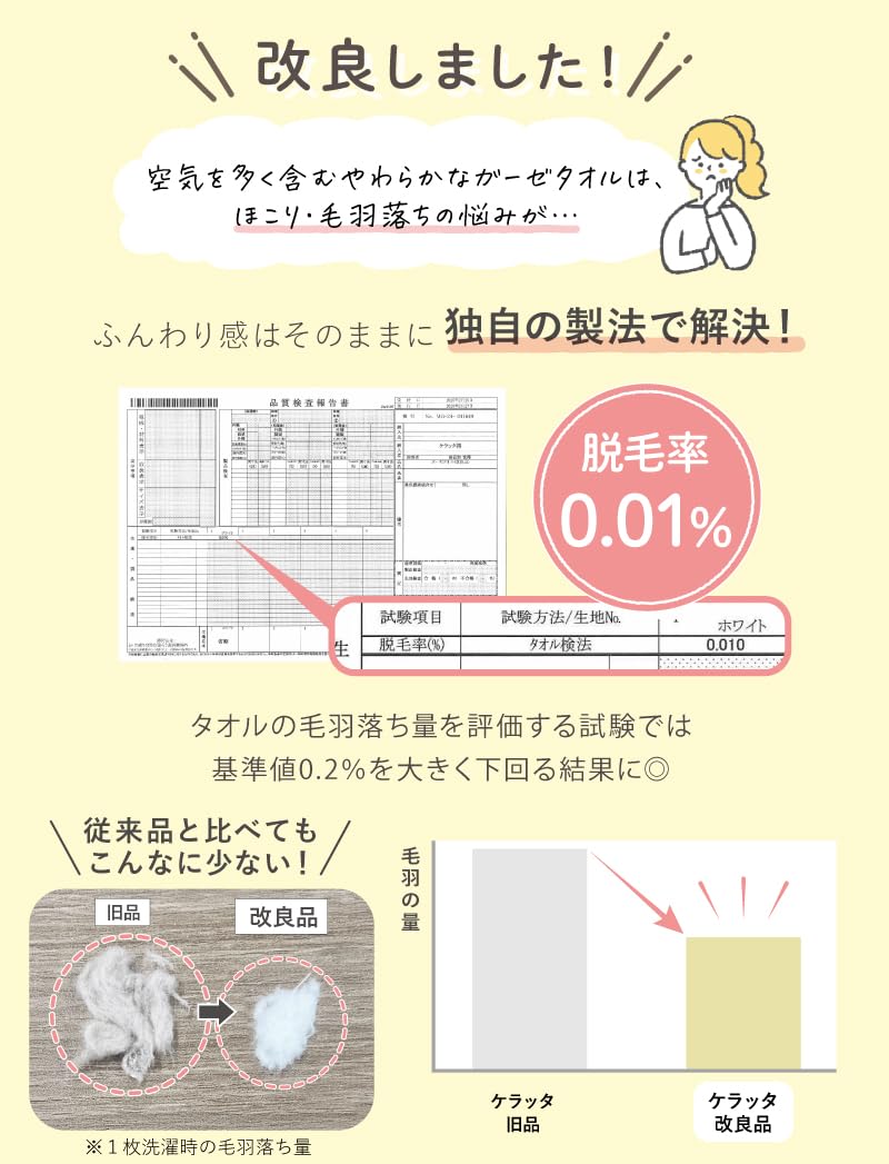 ※ケラッタのイブルガーゼバスタオルは天然繊維100%の製品のため、化学繊維とは異なりどうしても毛羽が出やすくなります。 洗濯回数を重ねると毛羽落ちが少なくなりますが、気になる場合は、たっぷりのお水でネットに入れず単独洗いをして毛羽を落としてください。 使用前に上記方法で洗濯することで余計な毛羽を落としより長持ちします。