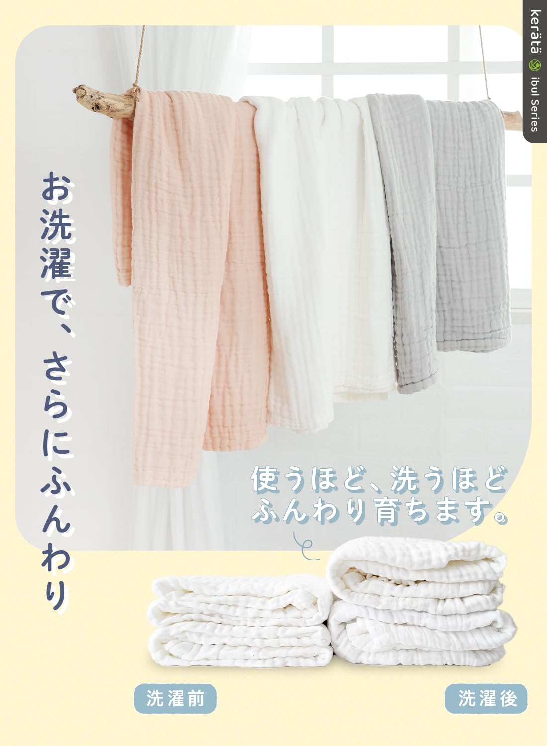 ケラッタのイブルシリーズから ベビーぴったりなガーゼバスタオルセットが新登場!イブルとは、伝統的な韓国寝具のこと。イブルの優しい風合いを生かしたコットン100%ガーゼを使用した、ふんわり贅沢な肌触りのガーゼタオルです。湯上りタオルはもちろん、おくるみ・シーツ・ガーゼケットなどいろいろな用途にお使いいただけます。
