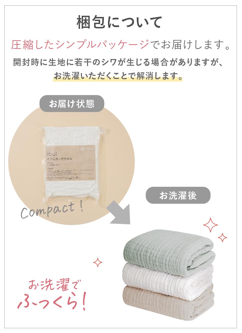 【お洗濯も楽々】通気性・速乾性に優れているのでお洗濯後も一般的なバスタオルに比べ早く乾きます。6重ガーゼタオルは、洗うたびに空気を含んでふっくら。使い込むほどに柔らかく肌になじみます。