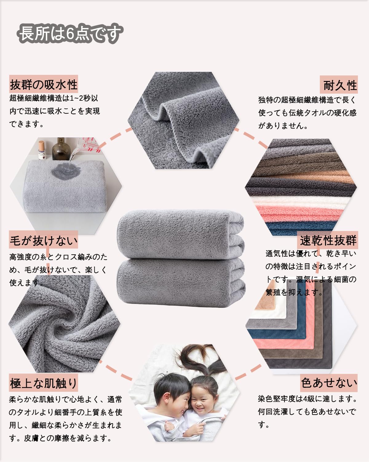 【抜群の吸水性と速乾性】綿の素材より吸水性が優れます。マイクロファイバー素材の表面は数えられない隙間があり、その隙間に大量の水分を素早い吸水できます。髪や肌にそっと当てるだけで水分が吸収される素材であり、また汚れも落としやすい特徴があります。隙間に取り込まれた空気が水分を拡散させるので、速乾性のポイントで、バスタオルの雑菌を抑え、健康を保つことができます。
