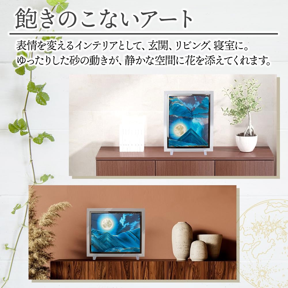 【飽きのこないアート】表情を変えるインテリアとして、玄関、リビング、寝室に。ゆったりした砂の動きが静かな空間に花を添えます。