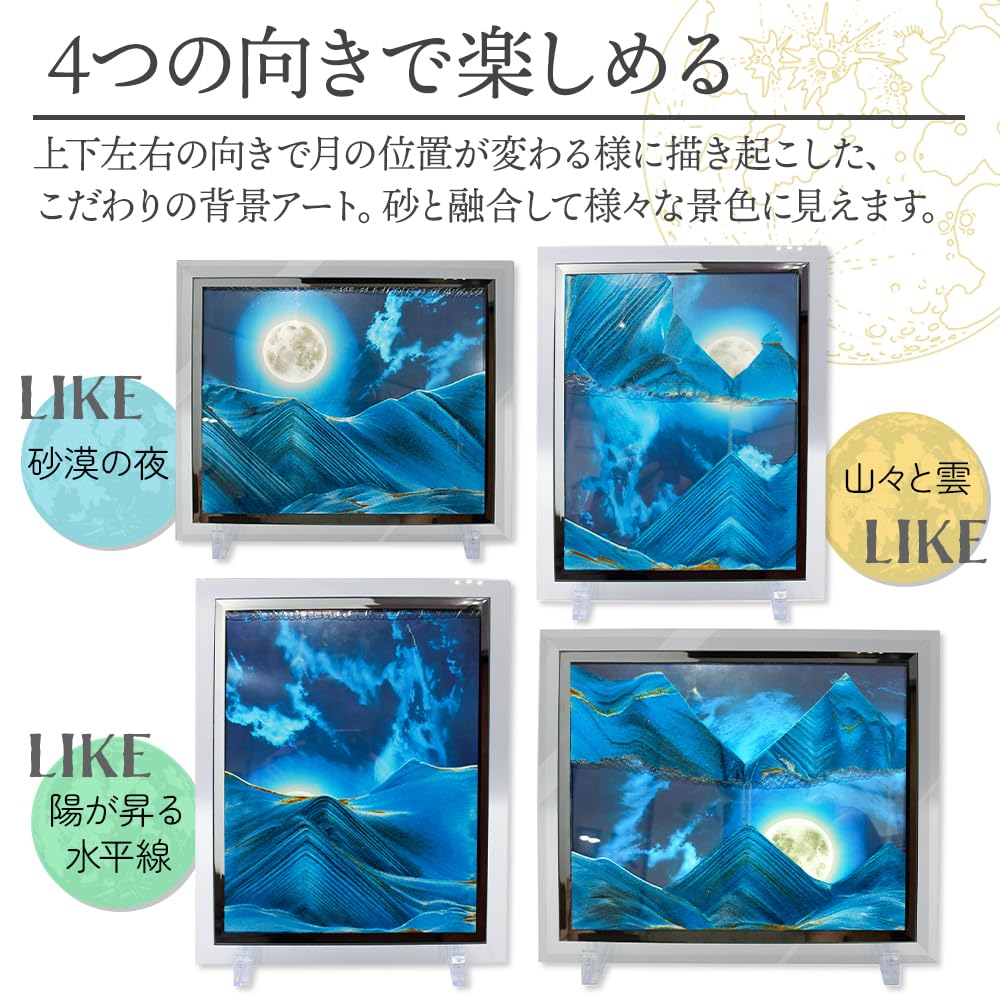 【4つの向きで楽しめる】上下左右それぞれの向きで、月の位置や雰囲気が変わる背景デザイン。砂との融和を計算して描き起こした、こだわりの背景アートです。
