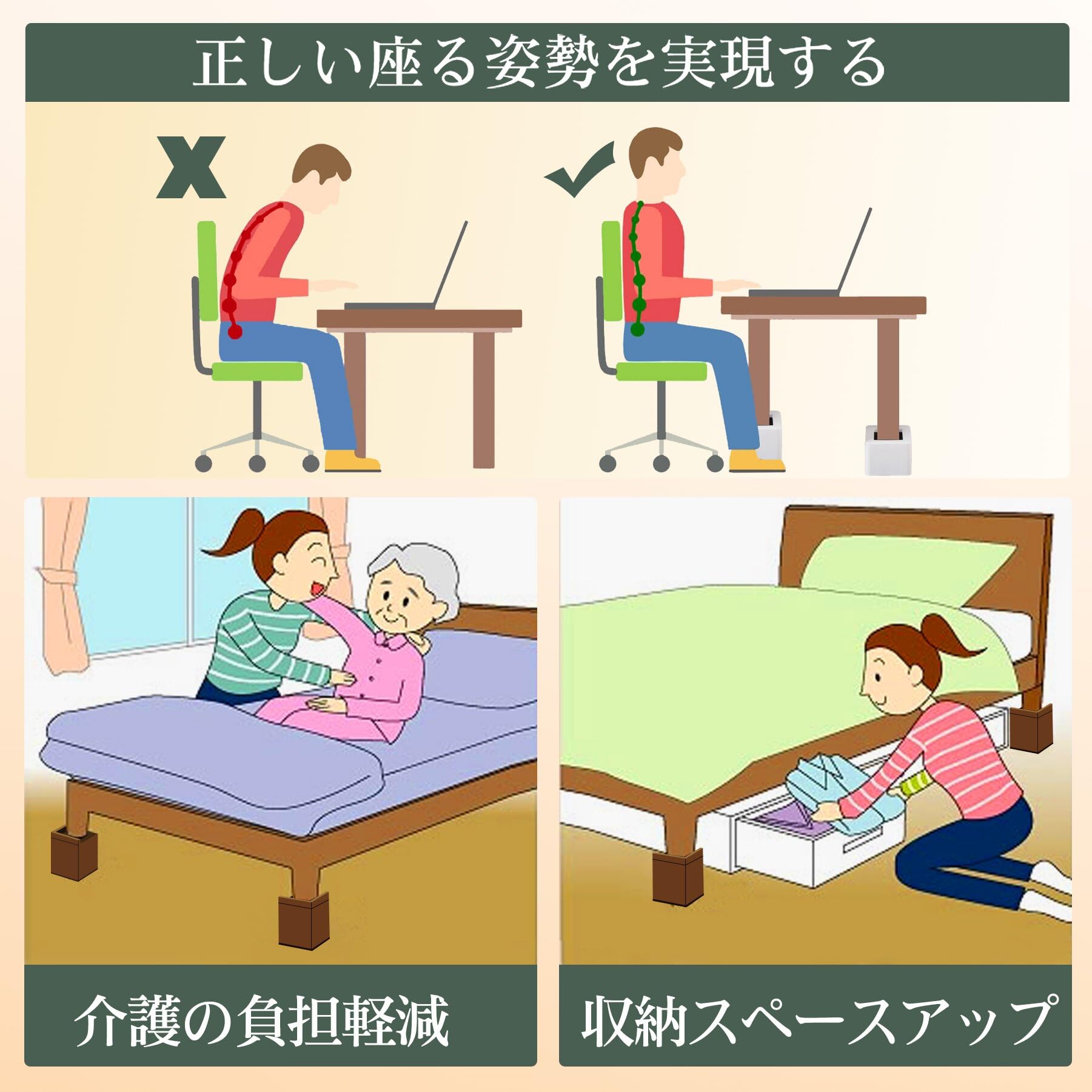 【使用効果】家具の脚を簡単に高くすることではなく、スペースをプラスし、掃除もらくになり、高齢者にとって助けナシでベッドから出れます。収納力アップももちろんアップします。