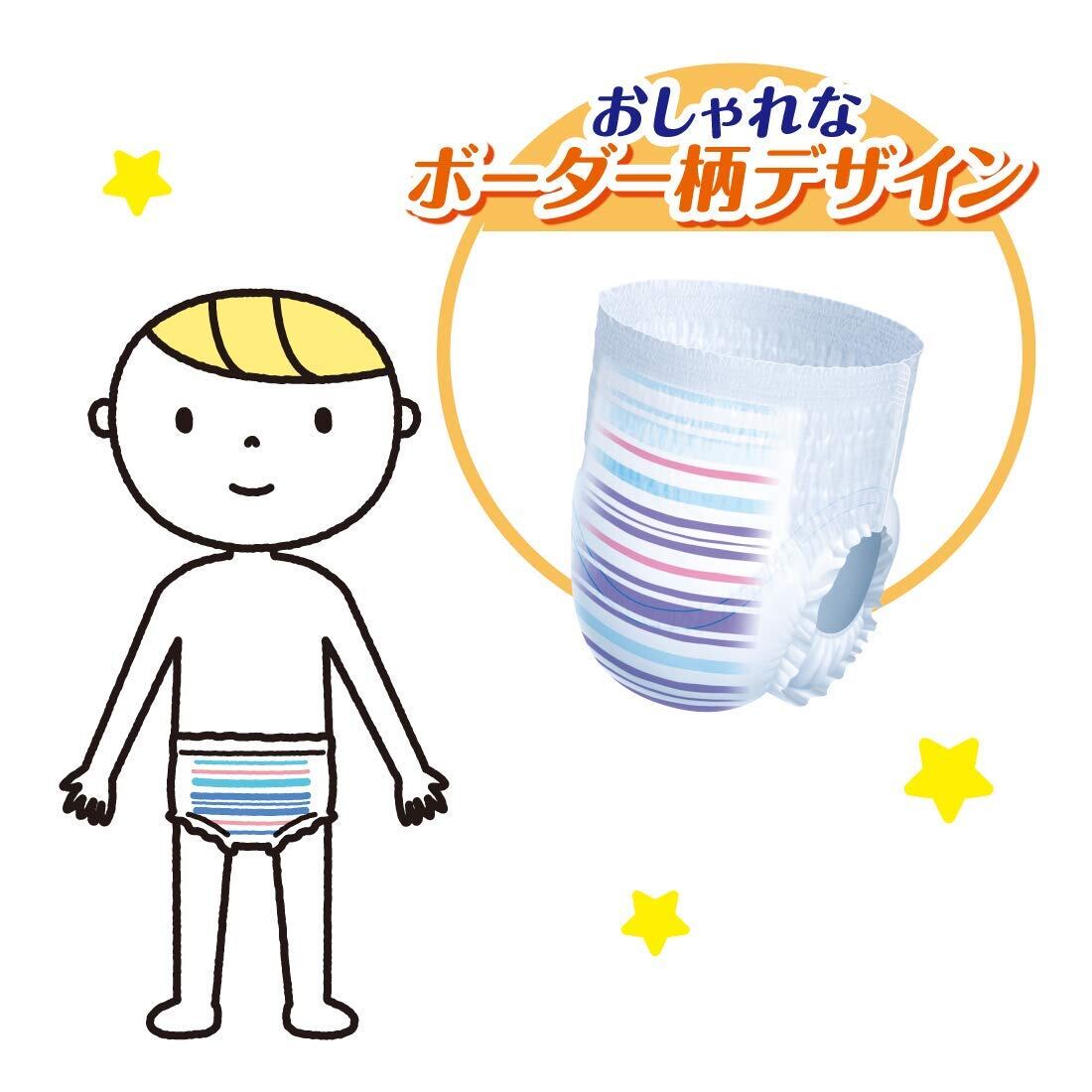 「グ~ン ナイトシリーズ」は公益財団法人日本デザイン振興会主催の2019年度グッドデザイン賞を受賞しました。 GOO.Nから夜用パンツが登場。身長から選べるKIDS90cm~120cm(13kg~25kg)JUNIOR110cm~140cm(15kg~35kg)の2サイズ。うつぶせ寝に強い前側スピード吸収だから、BIGサイズを卒業したお子さまにも。 ポイント1 うつぶせ寝に強い おむつ前側にすばやく吸収・拡散する“前側スピード吸収シートを採用しました。 通常紙おむつ(パンツL~BIG)と比較して、シートの厚みが約3倍なっているので前側からのモレにくい。 「U(ユー)」カーブフィットギャザーによって、大量に排尿しても吸収体を持ち上げる構造を採用しました。足まわりのフィット感が保てて、おむつと足まわりの隙間ができにくい構造です。 寝返りの激しいお子様でもすきまモレしにくい。 ポイント2 一晩中しっかり吸収パワー グ~ンBIGより大きいサイズと比べて、約1.2倍※の吸収量です。 うつぶせ寝で排尿しても、尿をしっかり吸収します。おしっこが多い日でも一晩中のしっかり吸収パワーです。 ※通常の紙オムツ(当社品BIGより大きいサイズ)比。 ポイント3 おしゃれなボーダー柄 シンプルなボーダー柄デザインで、小学生以上の男の子でも、女の子でも抵抗感のなく着用できます。