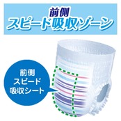 【うつぶせ寝に強い】おむつ前側にすばやく吸収・拡散する“前側スピード吸収シートを採用しました。通常紙おむつ(パンツL~BIG)と比較して、シートの厚みが約3倍なっているので前側からのモレに強い。