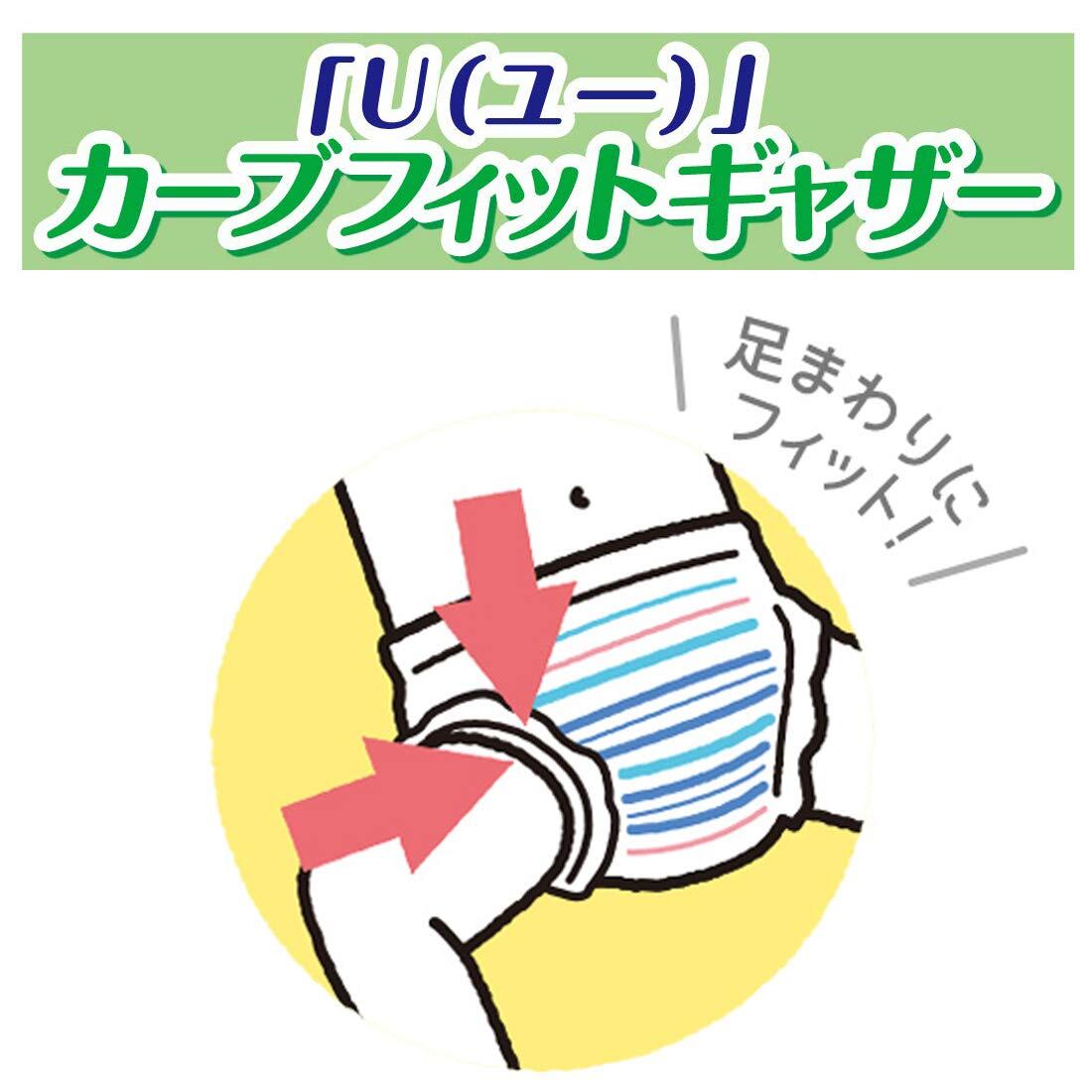 【「U(ユー)」カーブフィットギャザー】大量に排尿しても吸収体を持ち上げる構造を採用しました。足まわりのフィット感が保てて、おむつと足まわりの隙間ができにくい構造です。