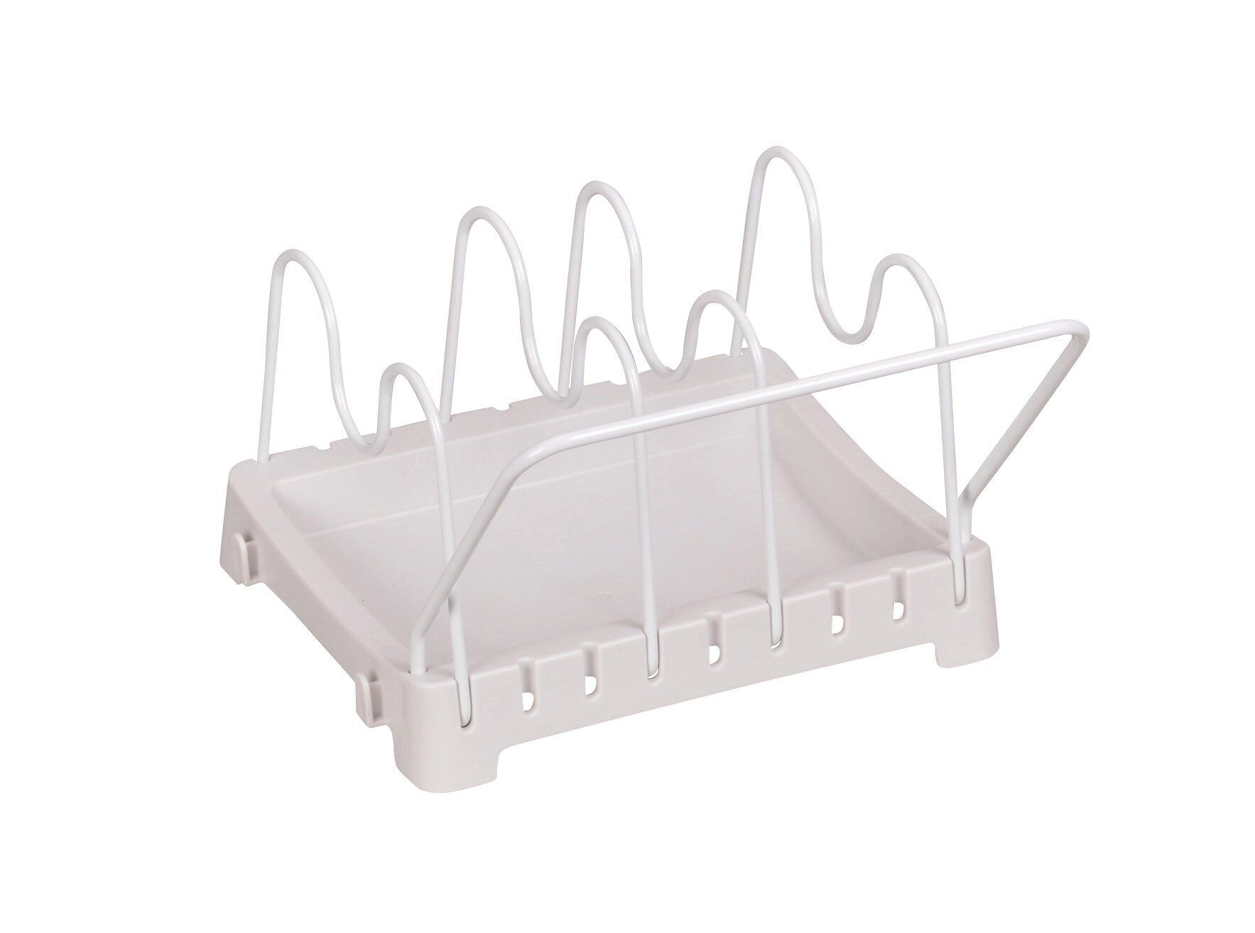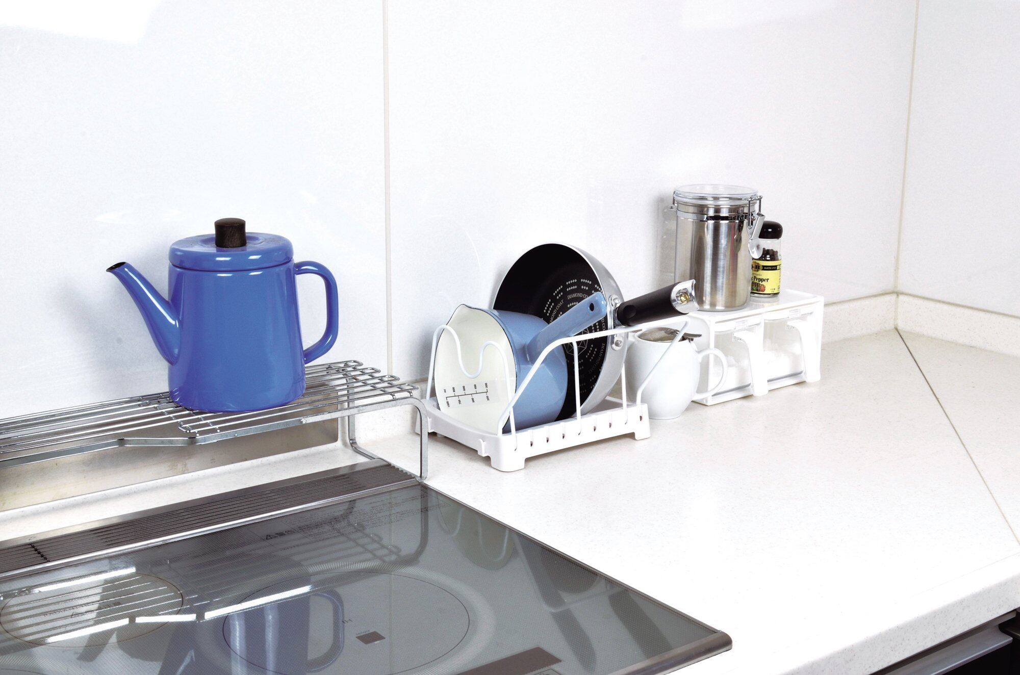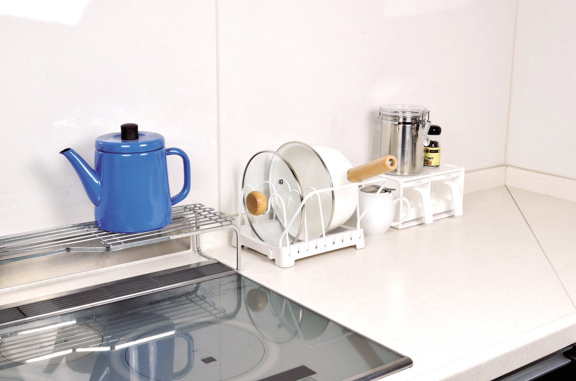 ー:鉄(メラミン焼付け塗装) すべり止め:シリコーンゴム 仕様 組立品 タテ置き・ヨコ置き兼用 仕切り4本付 製造国 日本 鍋やフライパンを引き出しにスッキリ収納!! 引き出し内で自由な向きで使えます。約14〜28cm