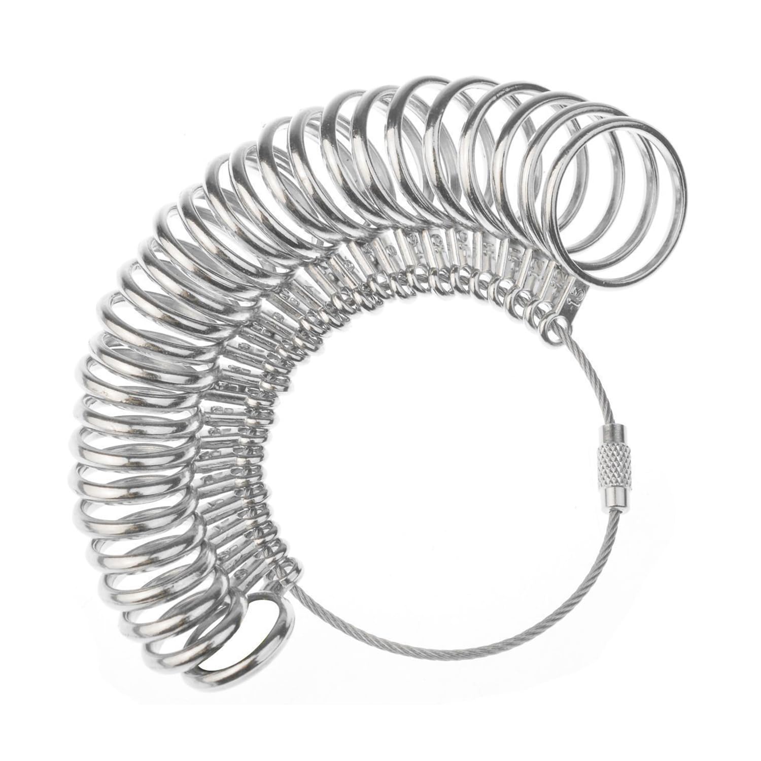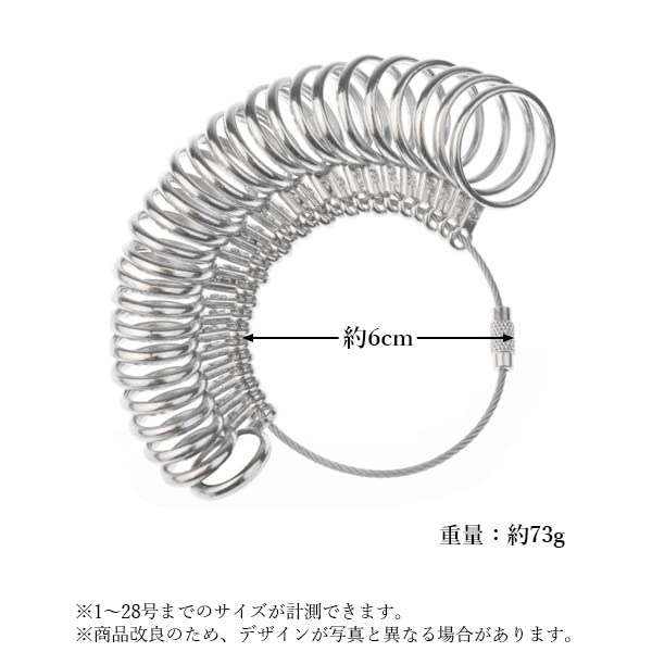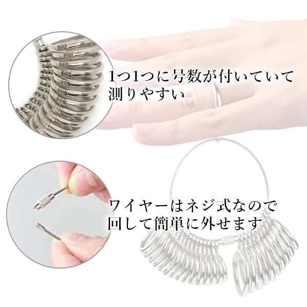 ・1〜28号までのサイズが計測可能です。 ・男性・女性問わず測ることができます。 ・ワイヤーはネジ式で回して簡単に外すことが可能です。 ・1つ1つに号数が付いているので測りやすく、バラバラになってもしまってもすぐに元に戻せます。