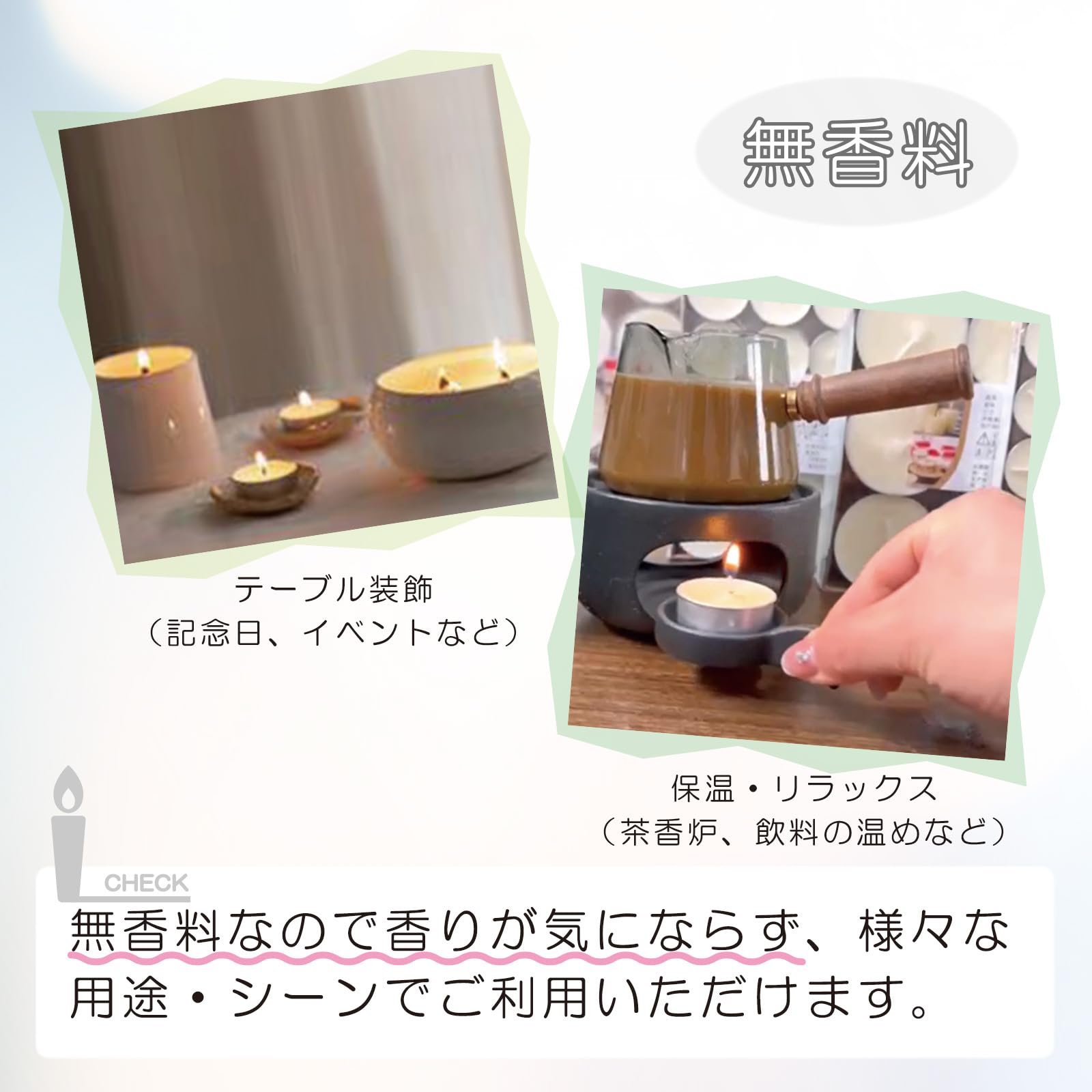 【ご使用のメリット】 シンプルで使いやすい「ティーライトキャンドル」は、無香料仕様で、どんなシーンにもマッチする高品質キャンドルです。本商品はアルミカップ入りで安全性にも配慮。溶け残りがほとんどなく、後片付けも簡単です。無香タイプなので、料理や香りに敏感な方にもおすすめです。