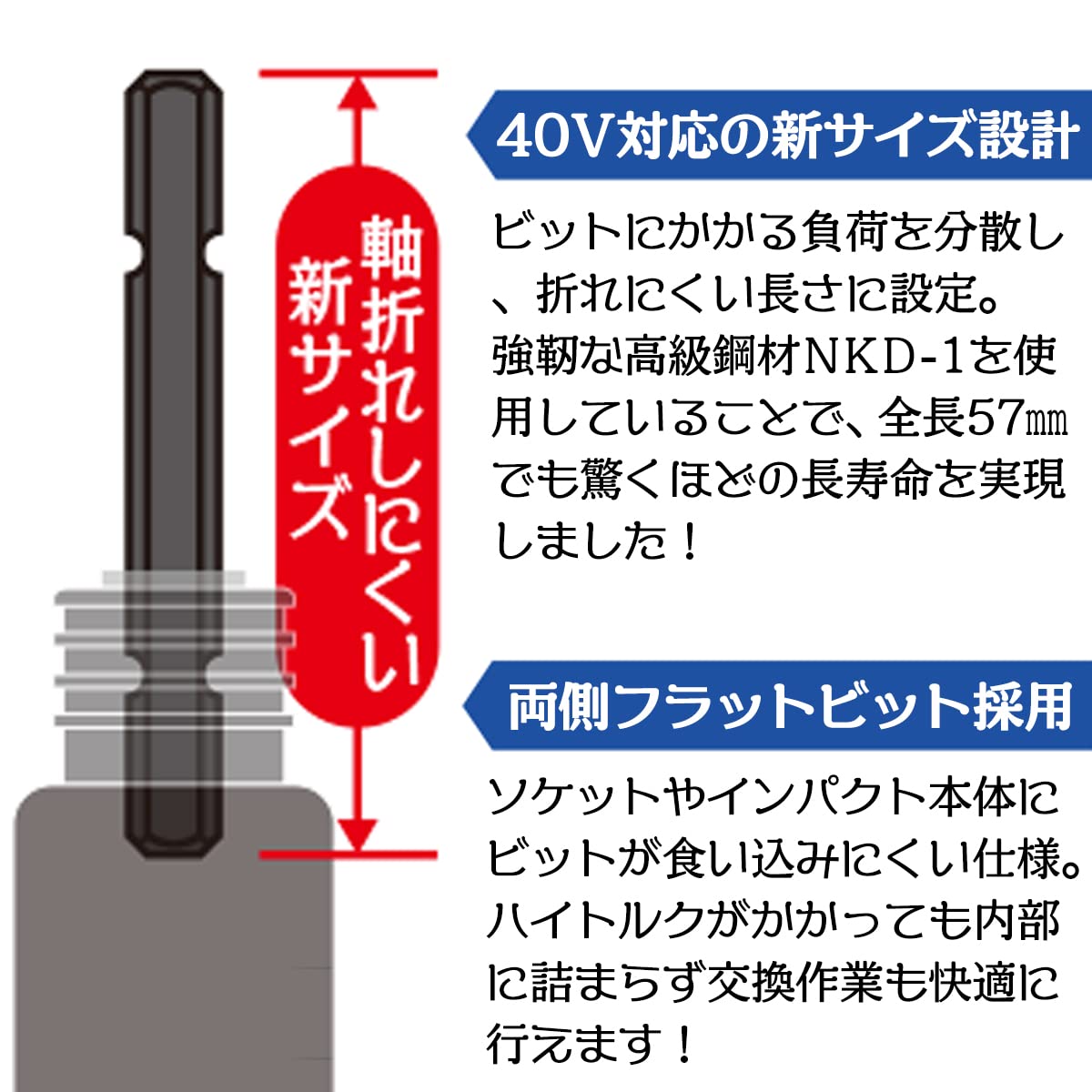 ●両側フラットビット:ソケット内部やインパクトドライバーのチャック内に食い込みにくい、両側フラット仕上げ。