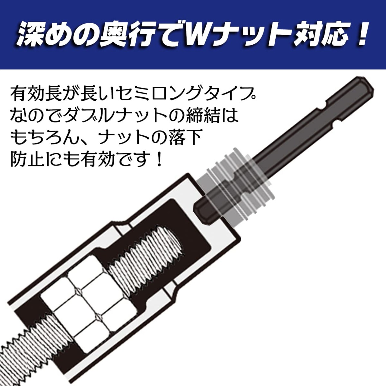 ●深めの奥行でWナット対応!:有効長が長いセミロングタイプなのでダブルナットの結合はもちろん、ナットの落下防止にも有効です。