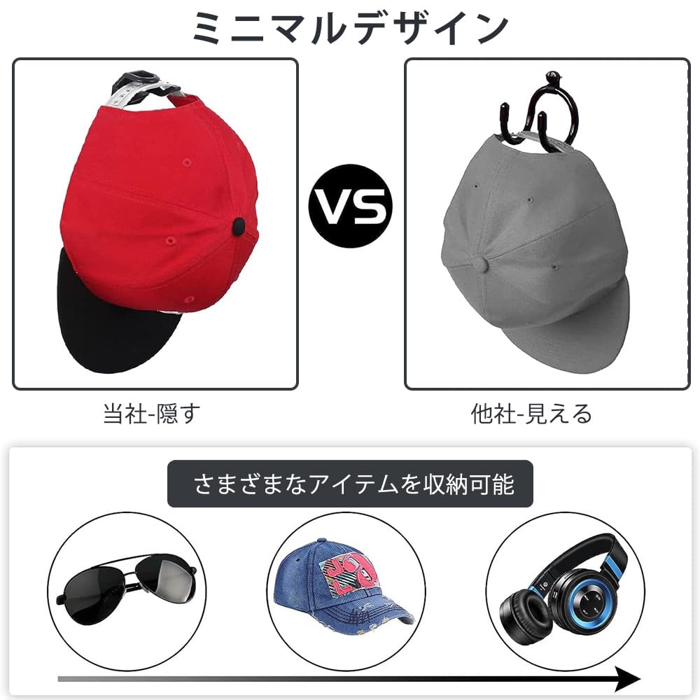 【多機能キャップハンガー】:ベースボールキャップ、フィットハット、サンハット、フラットブリムハットなど様々なタイプの帽子に最適です。また、ヘッドフォンやキー、スカーフとしても使用できます。ドア、壁、クローゼット、寝室、バスルーム、玄関、オフィス、店舗などに置くことができます。