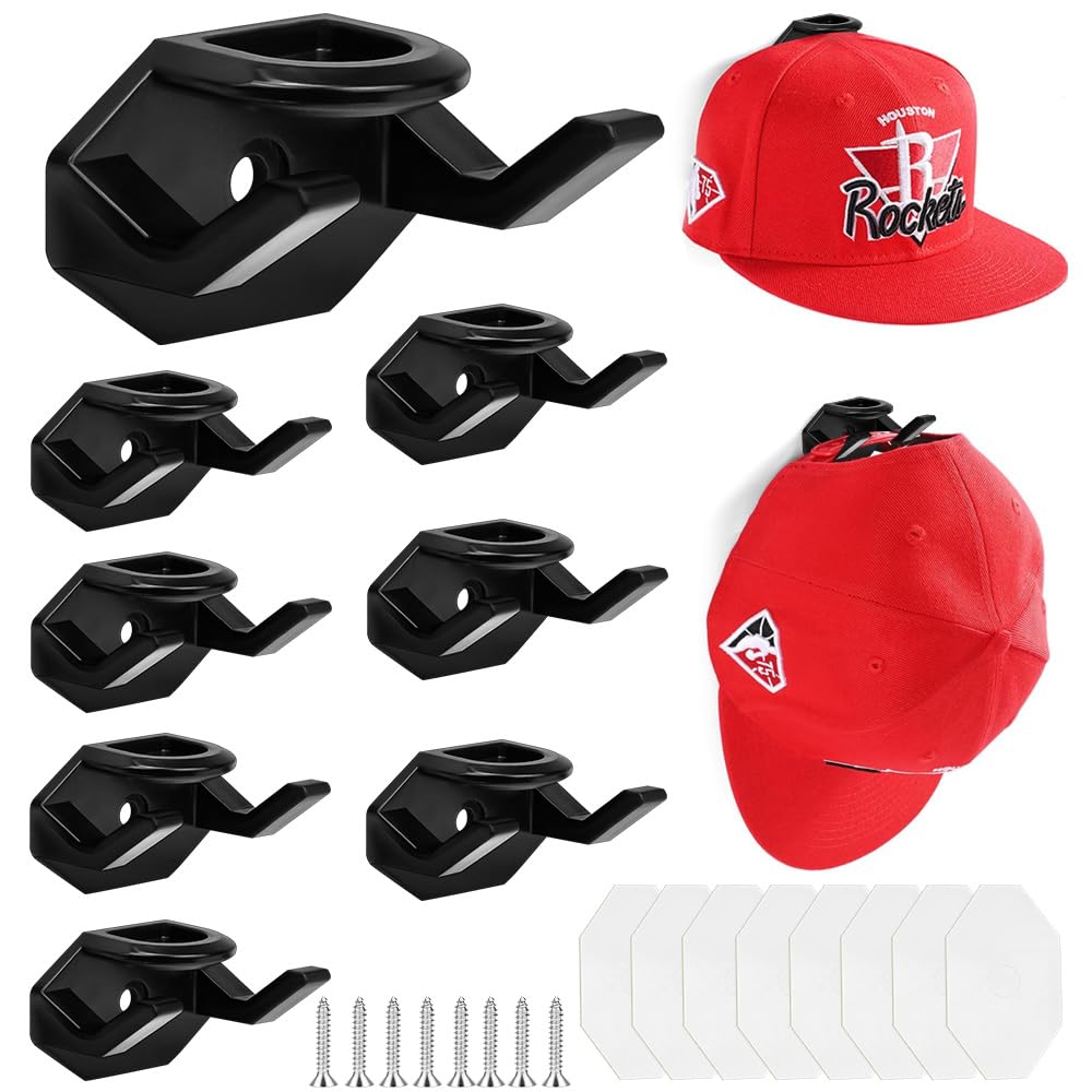 【パッケージ内容】:パッケージには8個の帽子フック 、8枚ネジと8枚付属の両面接着剤が含まれます。帽子がぶら下がっている時、帽子のフックはほとんど見えませんし、サポートエリアは帽子のベアリングエリアを増やすことができる曲面デザインで、帽子がぶら下がって変形するのを防ぎます。