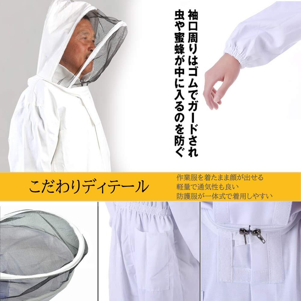 【こだわり】■フェイスネット:フェイス下のチャックがあり、服を着たまま顔が出せますし、途中での飲食も容易で便利です ■手首・足元をゴムでしっかりガードしており、虫や蜂の侵入を防ぎます。 ■顔面部分はメッシュ生地、ほかの部分は通気性も良く夏場の作業も快適です。 ■ウエスト部分には便利なポケットがあり、さまざまなアイテムが収納できます。 ■脱着がしやすくて便利です。