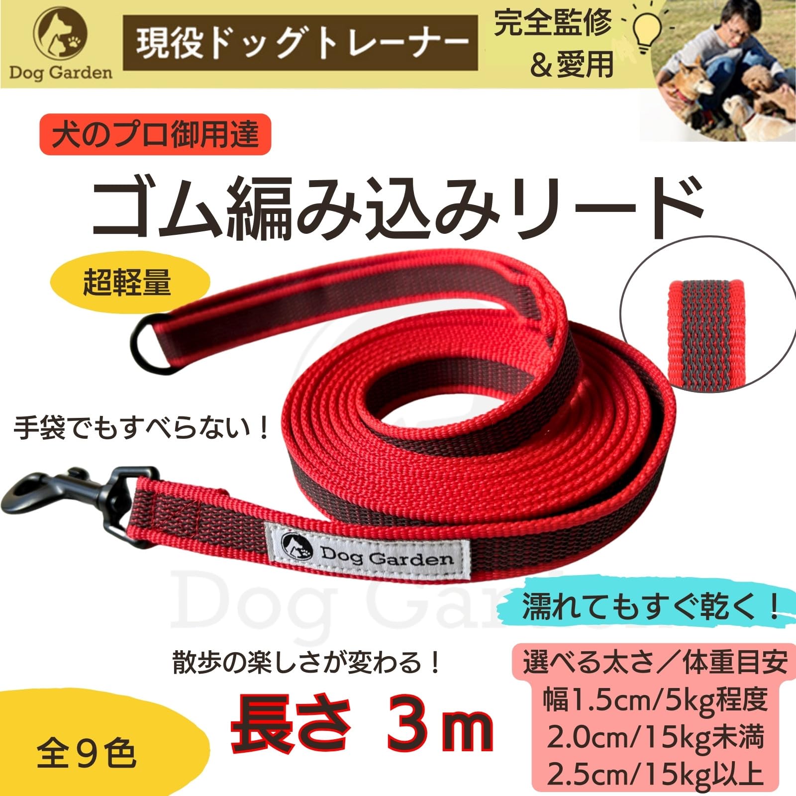 DogGardenすべらないリード 3m 小型犬~中型犬用 肩掛けリード 呼び戻し練習 軽い 洗える すぐ乾く (レッド リード幅2.0cm)