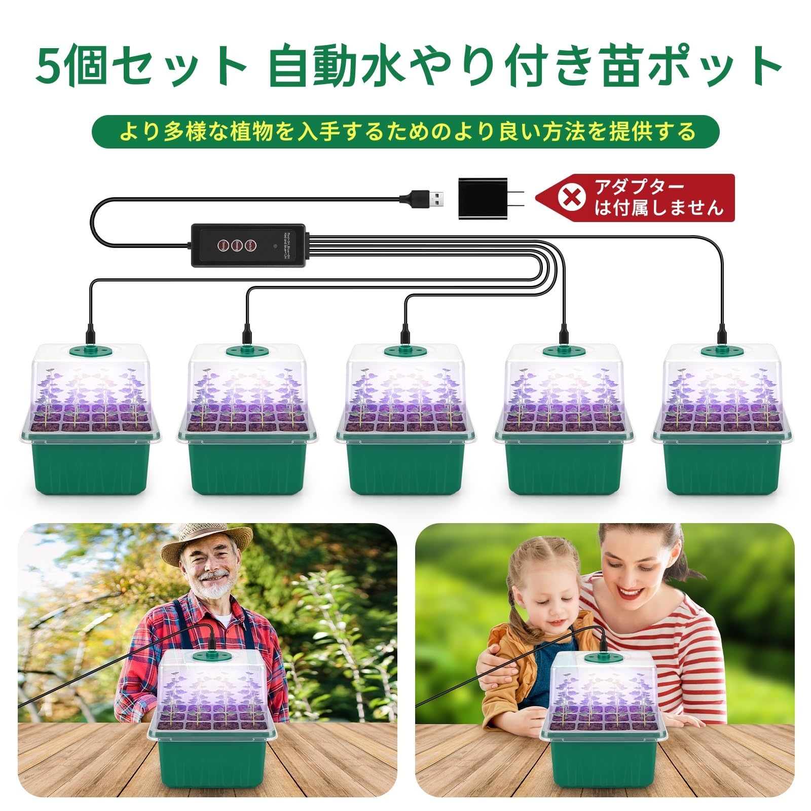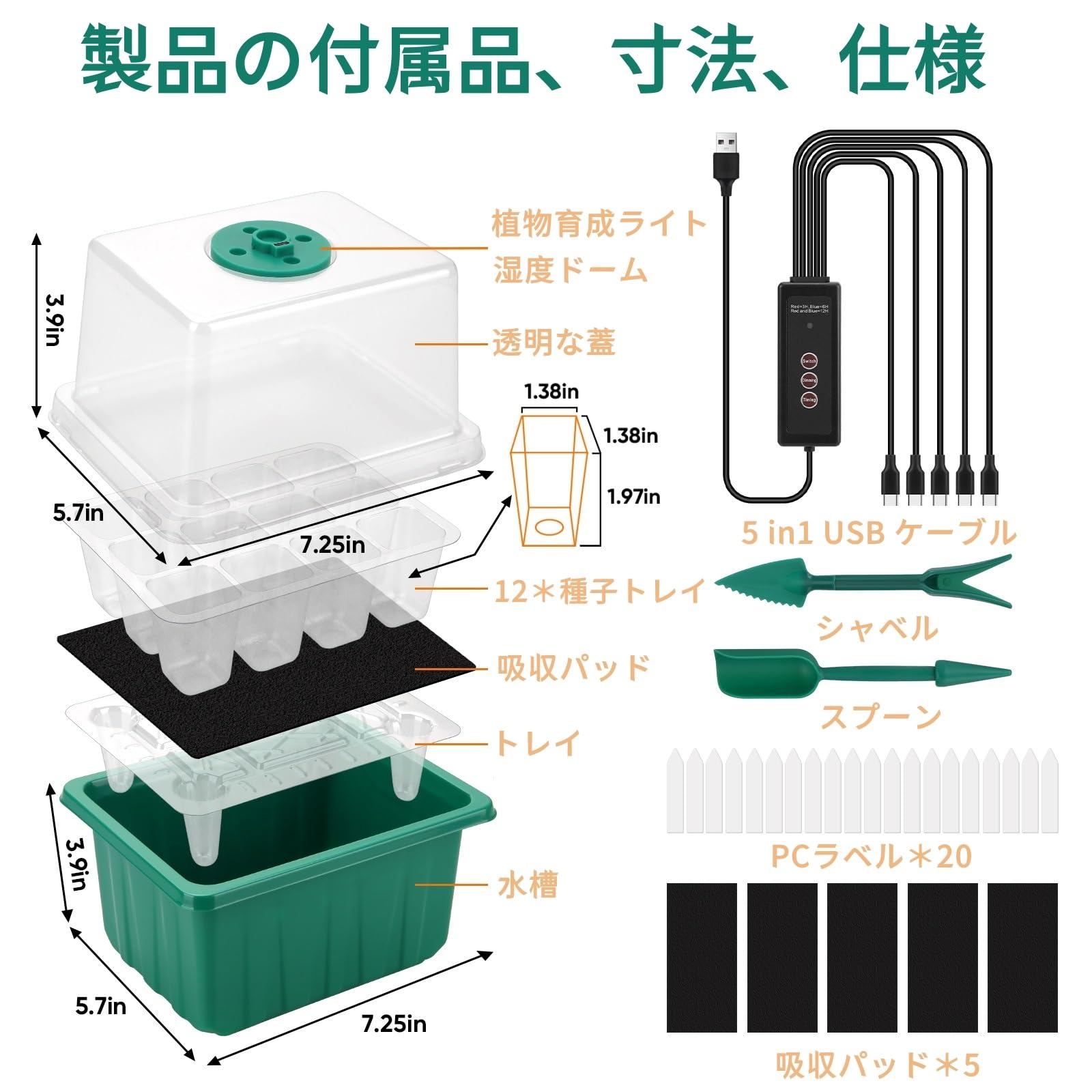 【?品仕様】サイズ:約21.6*18.4*17.8cm。素材:プラスチック。パッケージ内容:育苗ポット*5、透明カバー*5、底部トレイ*5、湿度リッドドーム*5、植物ラベル*20(苗の栽培時間を記録用)、調節可能なスイッチ*1、移植ツール*2、黒の吸収パッド*5。12穴/個、5個セットの育苗ボートで、総計60穴あり、一気に60ユニットの植物育てができられますので、家で育苗を楽しんでやりましょう!