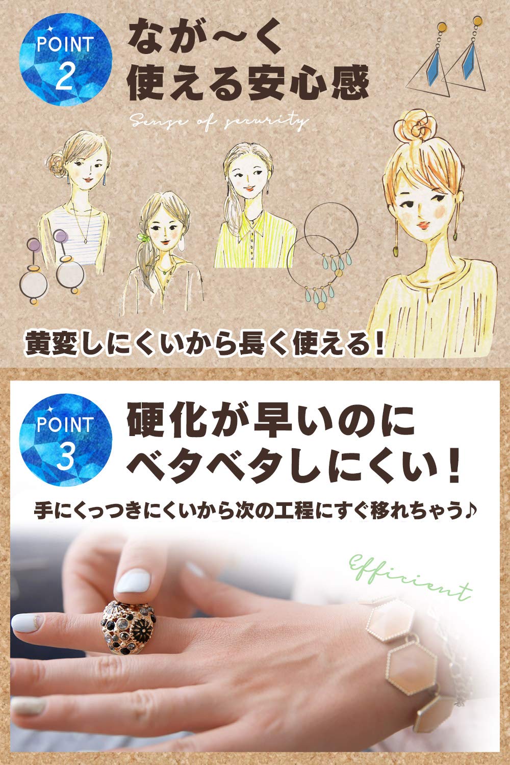 ?【 硬化後のベトベト感 & 黄変のお悩みを解決!】 硬化が早いのにベタつき感が少ないから次の工程にすぐ移れてスムーズに作業ができる!※1 また、黄変しにくいから自分だけの作品をなが〜く使えてうれしい♪ ※2