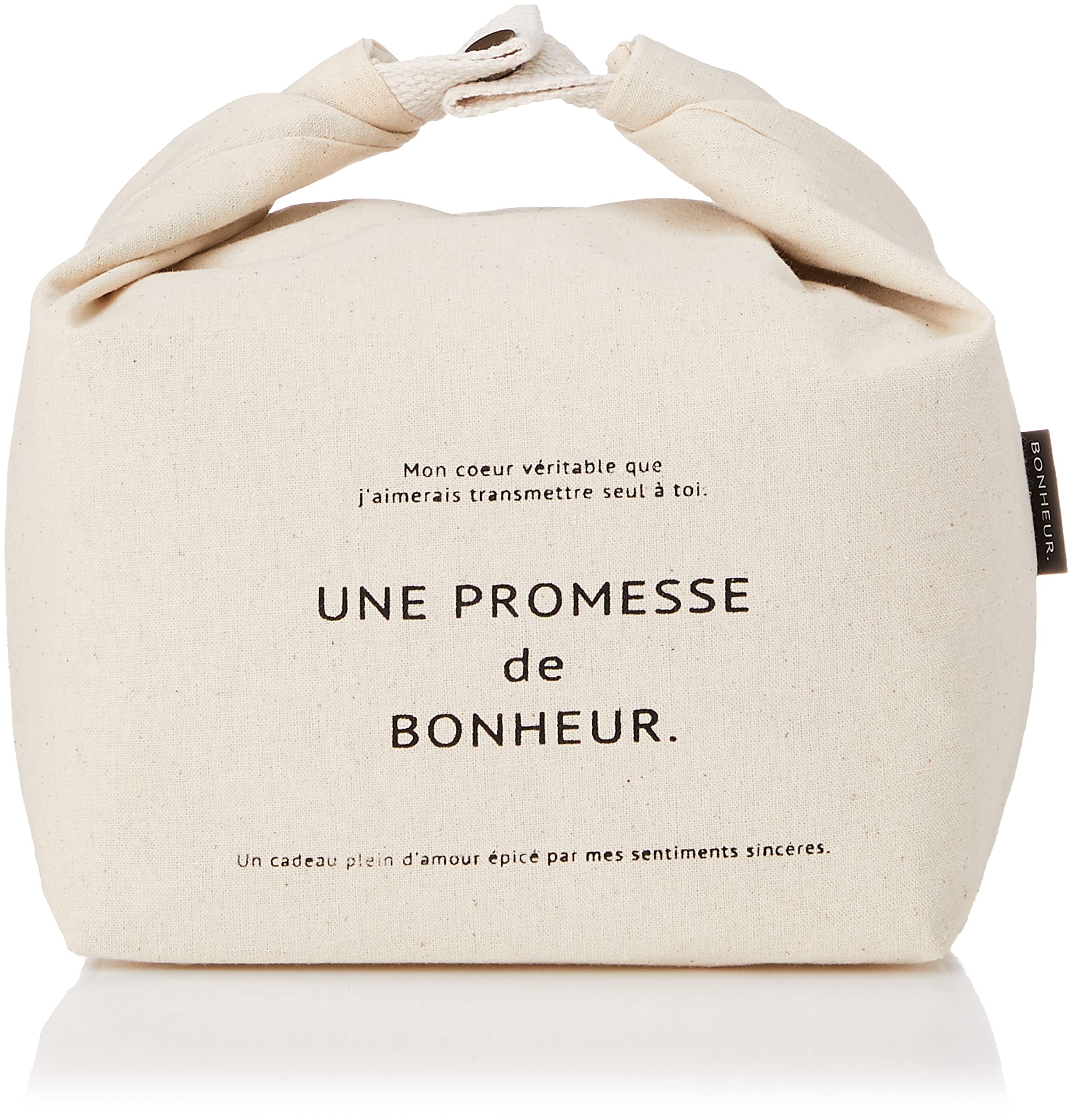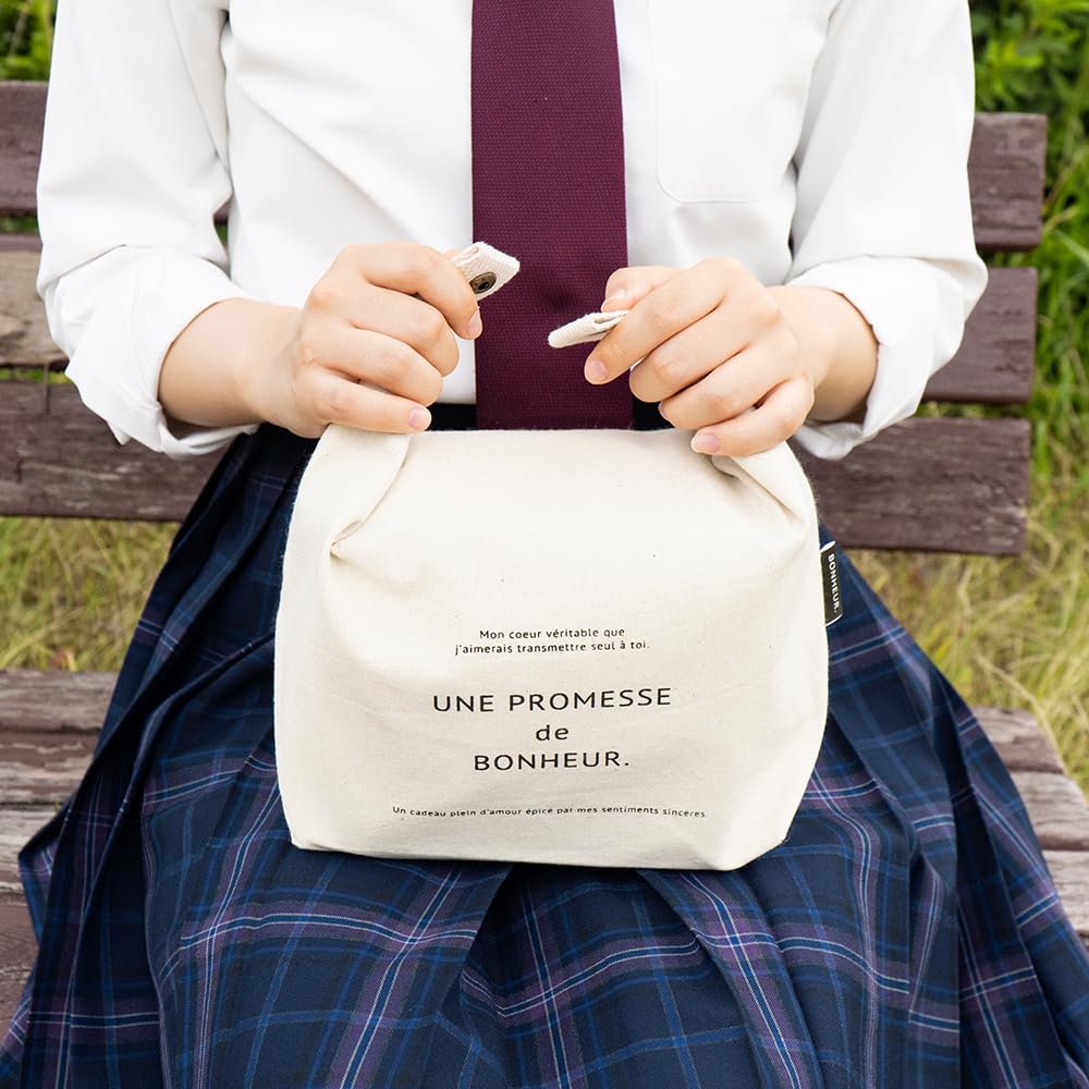 内側が撥水加工のバッグです。上の部分をくるっと巻いて留めることができます。軽い保冷効果があり、お弁当箱袋などのリユースにもおすすめ。 ゼリーのスタンドバッグが8個入るほど良い大きさとコロリとしたフォルム、帆布のザックリとした風合いが、シンプルなボヌールシリーズのデザインを引き立てる使いやすい布バッグです。