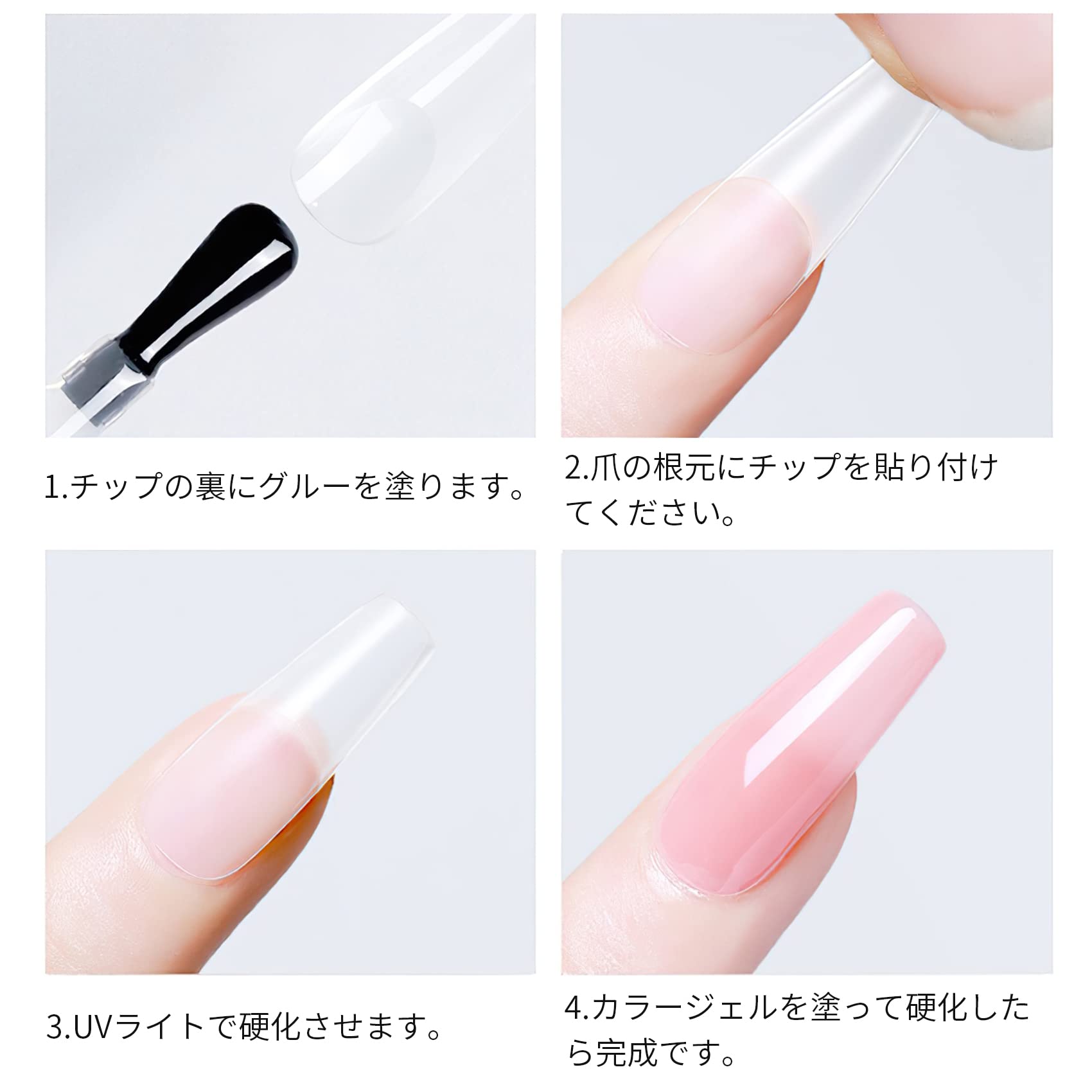 ネイルの装着:まずは自分の爪の大きさにあったネイルチップを決めて、 チップの裏にグルーを塗って貼り付けてファイルで爪の長さや形を整えます。最後はダストを除去してジェルを塗って硬化したら完成です。
