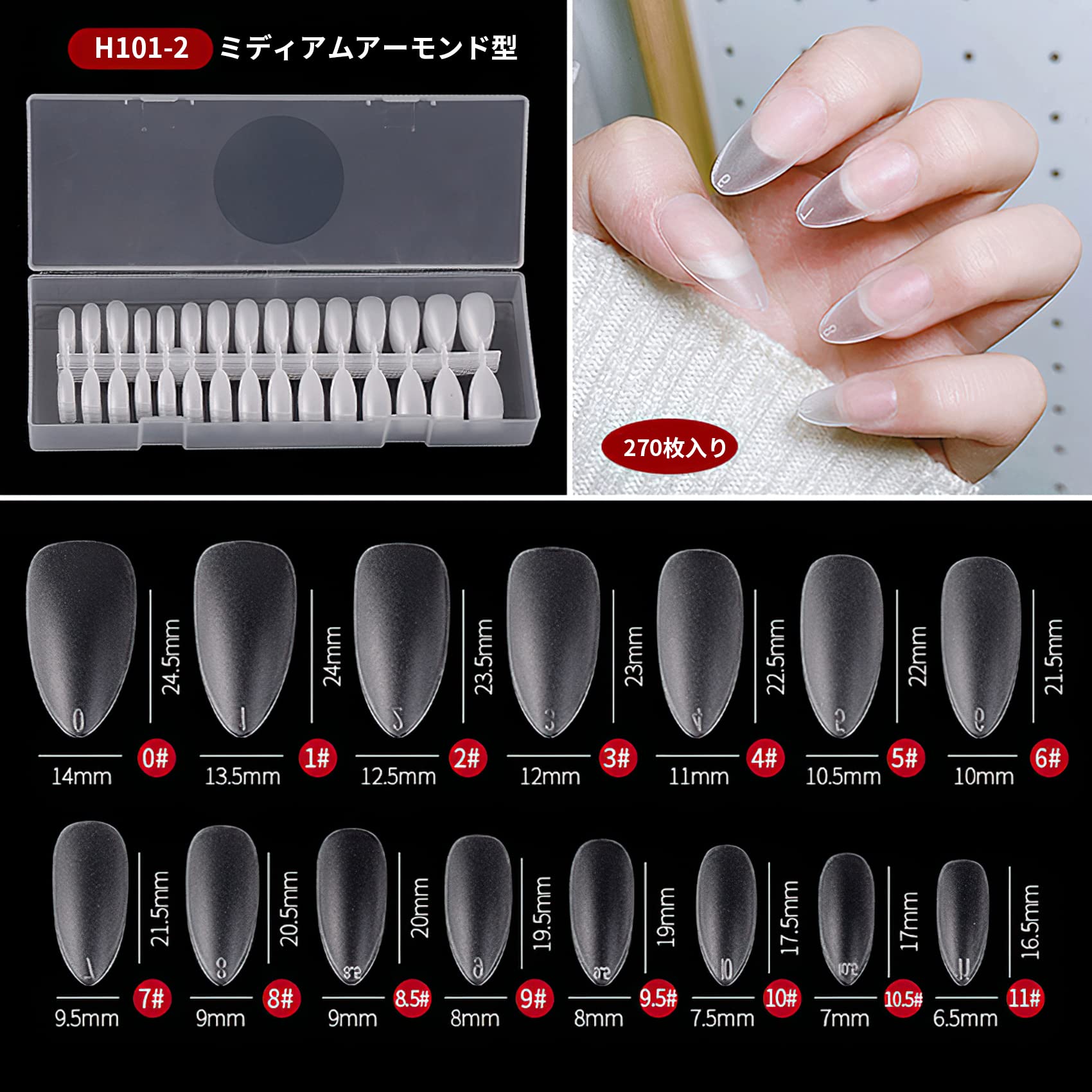 大容量で実用:ミディアムタイプのアーモンド型ネイルチップセットです。15種類のサイズで様々な自爪のサイズに対応可能、合計270枚入り。付け爪、練習用どちらにもお使いいただけます。