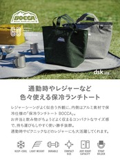 レジャーシーンがよく似合う外観に、内側はアルミ素材で保冷仕様の「保冷ランチトートBOCCA」。お弁当と飲み物がちょうどよく収まるコンパクトなサイズ感で、持ち運びもしやすく使い勝手抜群。