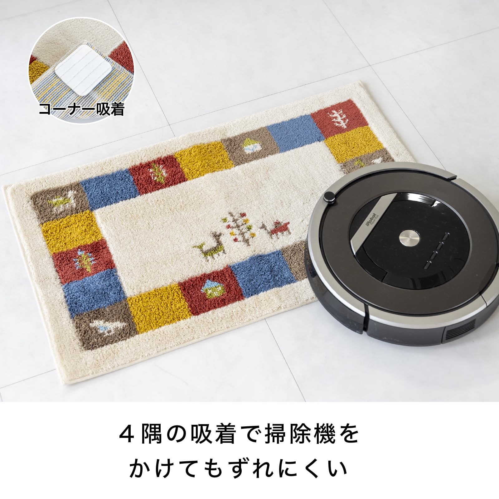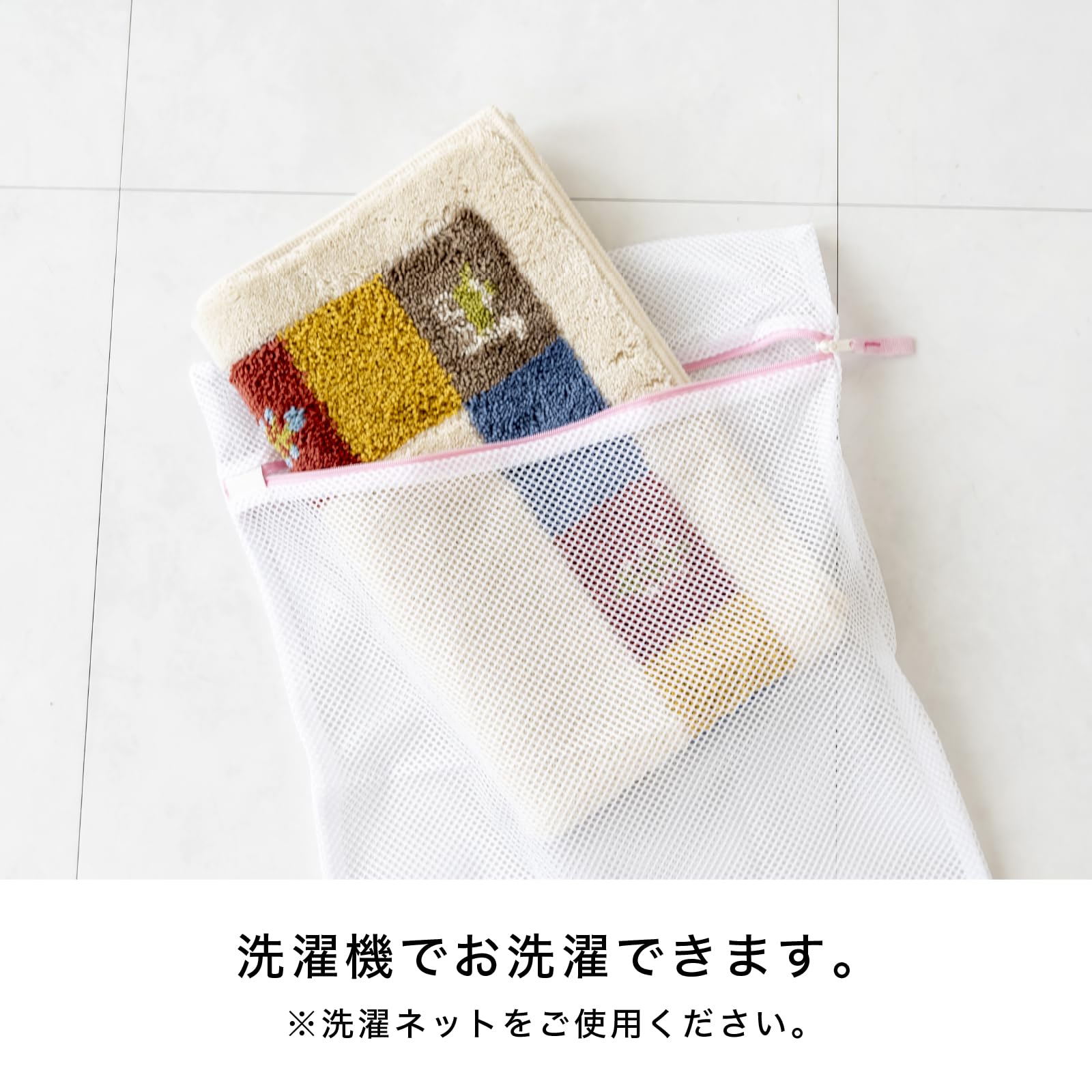 洗濯に強く毛立ちの良い裏面の四角に吸着シートがついているので、人が行き来する場所でもずれにくく、掃除機をかけるときなどもめくり上がりにくいので掃除がしやすくなってます。ご家庭の洗濯機で丸洗いできるので、お手入れが簡単なのもポイントです。