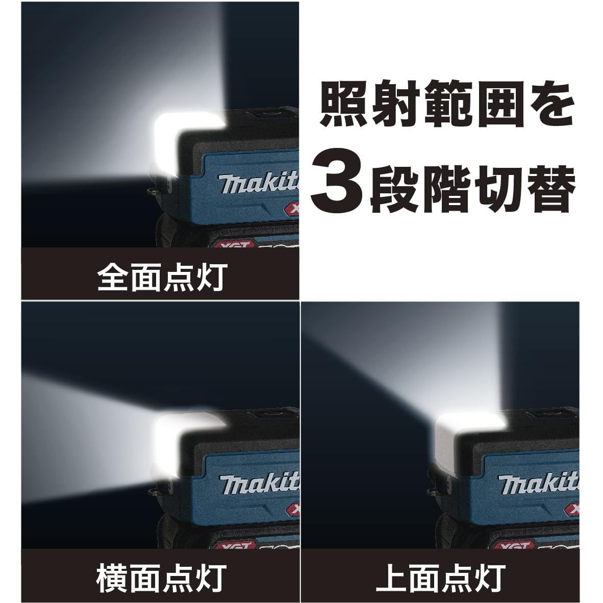 照射範囲切替可能。ライトスイッチを押すたびに全面点灯・横面点灯・上面点灯・電源OFFと切替が可能。電源OFF時に前回の照射モードを記憶するメモリ機能も搭載。