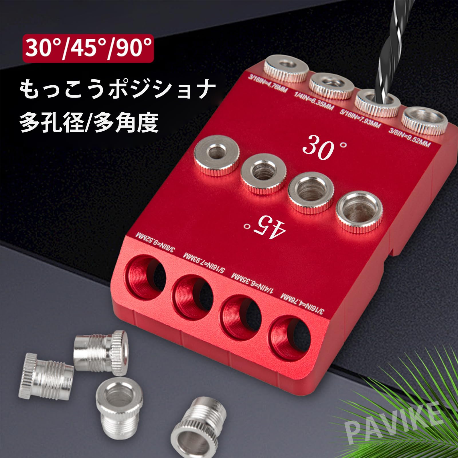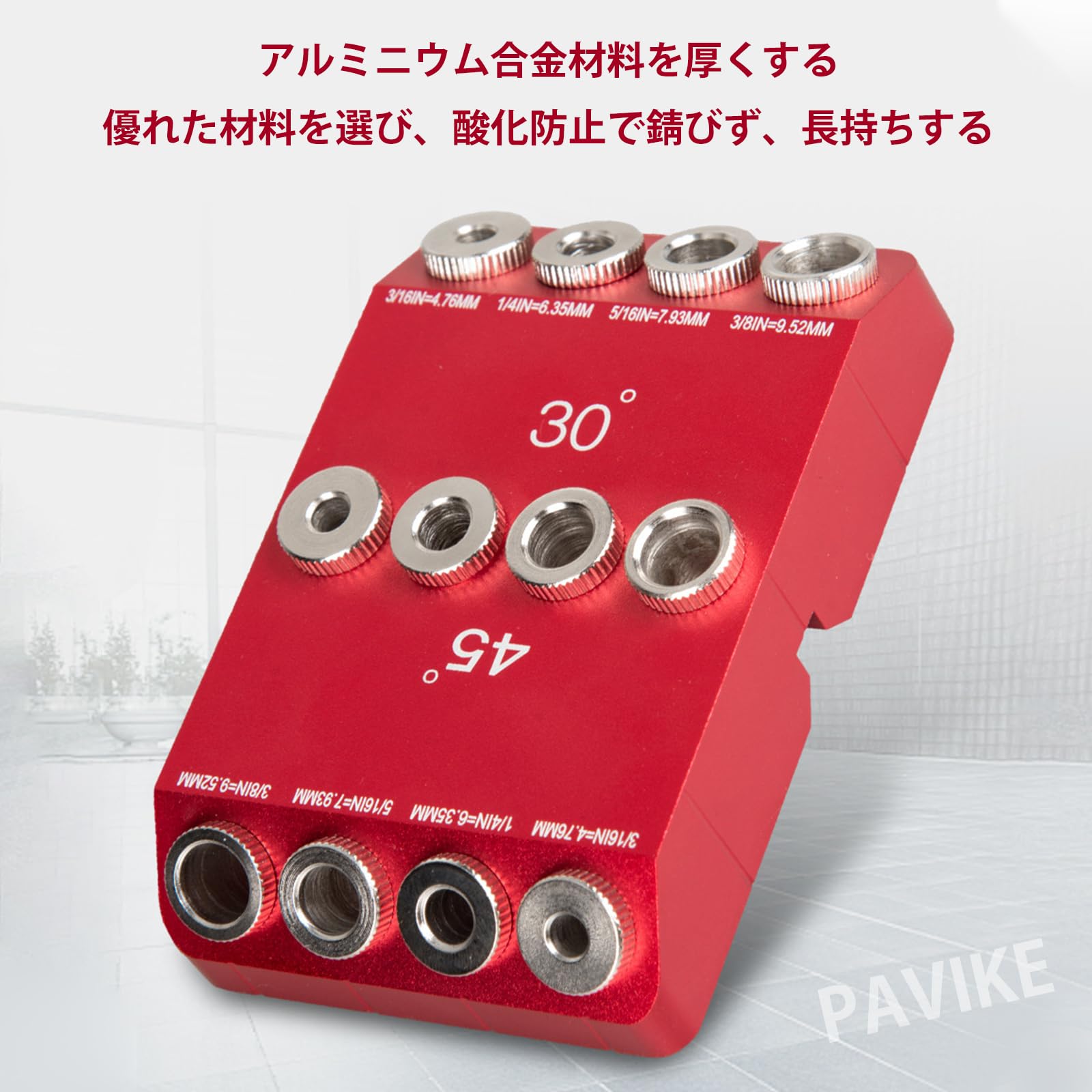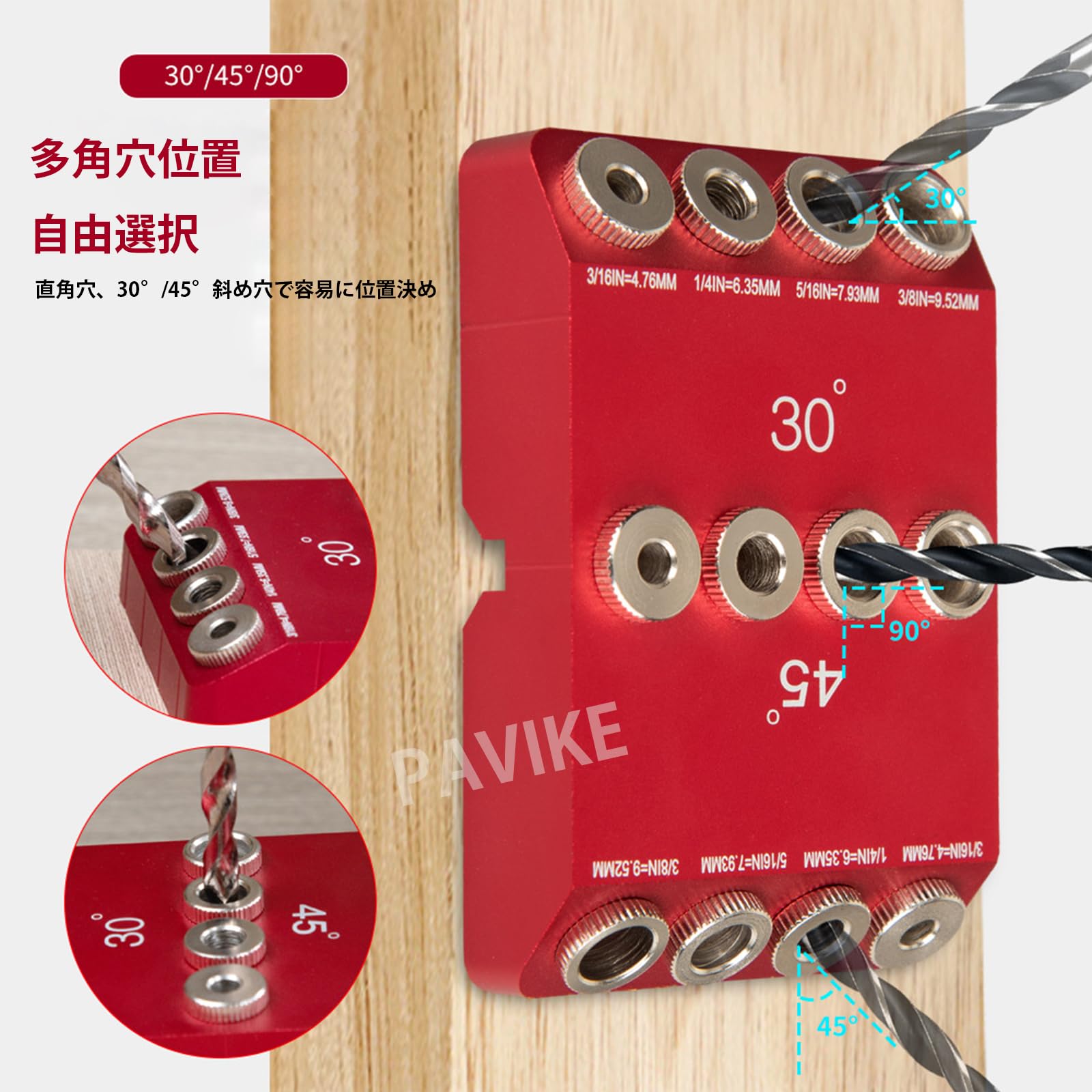 【使いやすさ】3つの角度(30°、45°、90°)と4つの穴径(3/16インチ(4.76 mm)、1/4インチ(6.35 mm)、5/16インチ(7.93 mm)、3/8インチ(9.52 mm))から選択でき、穴あけ時に何度も測定や調整を行う必要がありません。初心者でも、まっすぐできれいな穴や角度のついた穴を開けることができ、家具の組み立てやフレームの組み立てにおいてシームレスな接合を実現します。