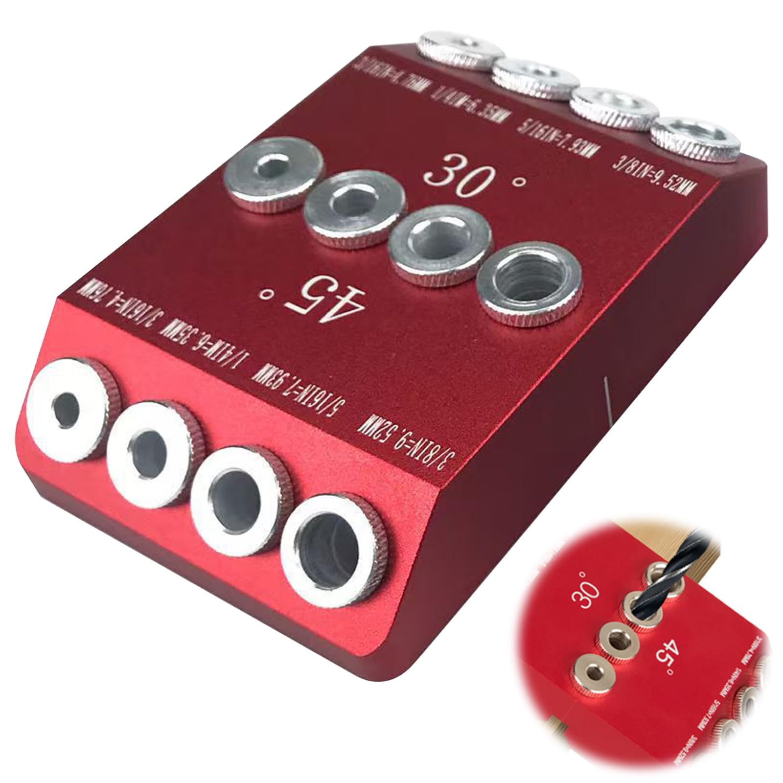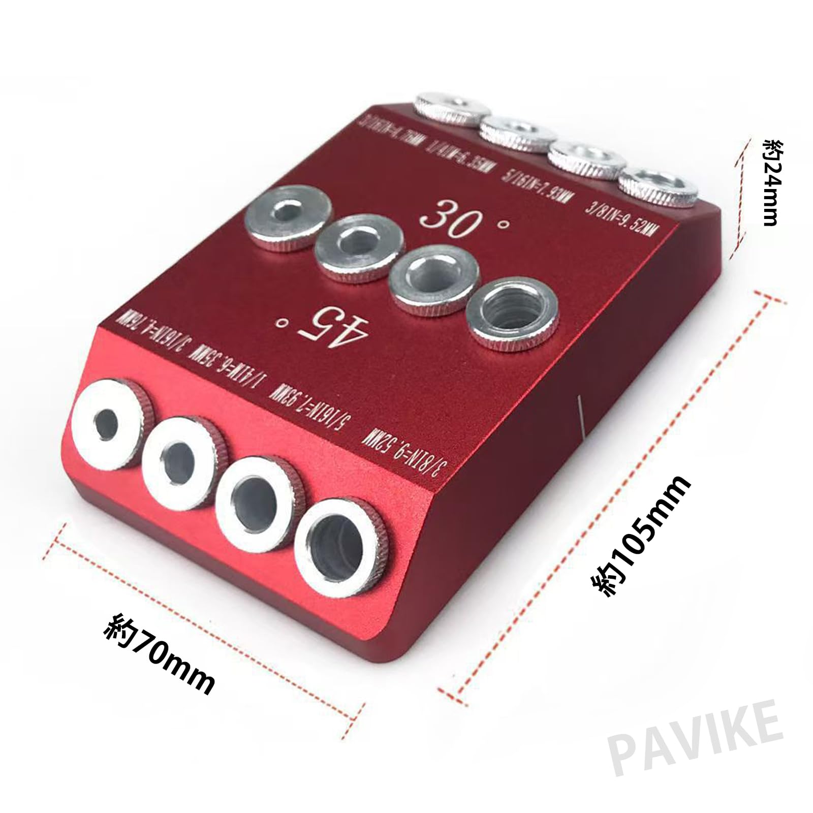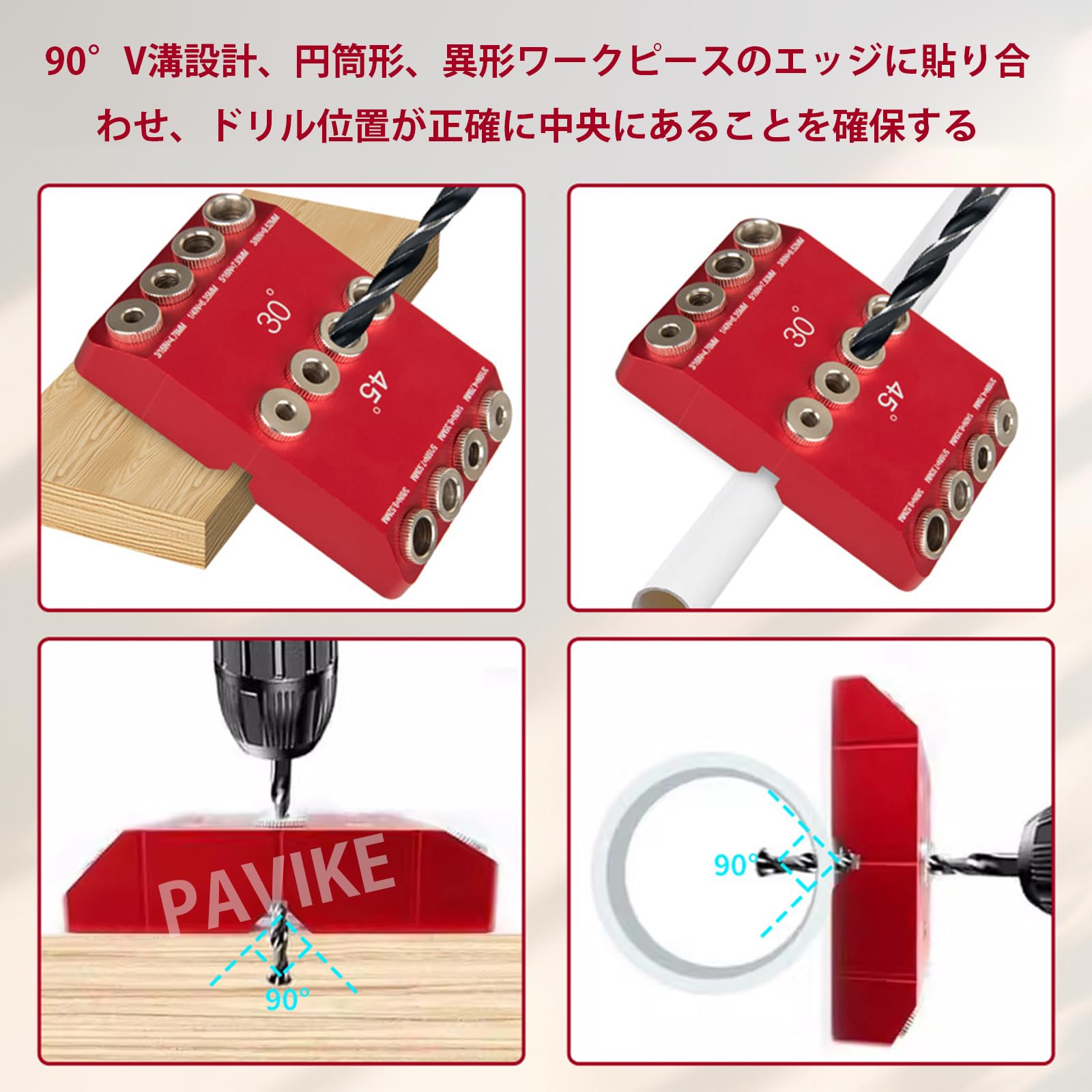 【使いやすさ】3つの角度(30°、45°、90°)と4つの穴径(3/16インチ(4.76 mm)、1/4インチ(6.35 mm)、5/16インチ(7.93 mm)、3/8インチ(9.52 mm))から選択でき、穴あけ時に何度も測定や調整を行う必要がありません。初心者でも、まっすぐできれいな穴や角度のついた穴を開けることができ、家具の組み立てやフレームの組み立てにおいてシームレスな接合を実現します。