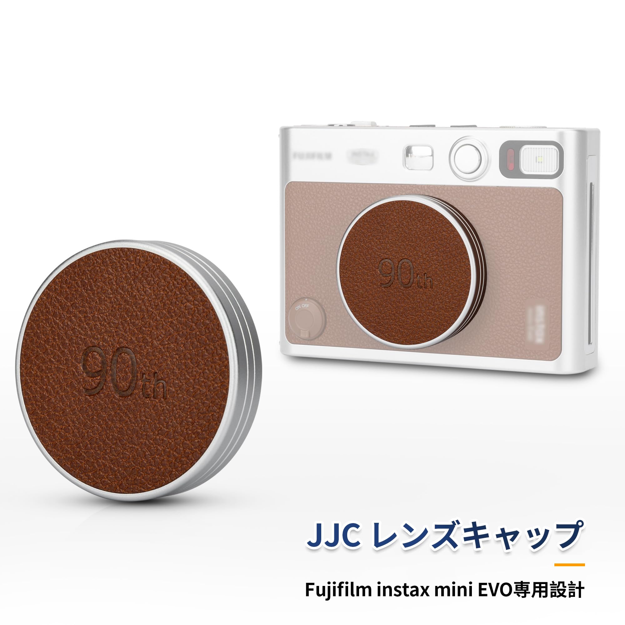 JJC instax mini evo 専用皮革レンズキャップ チェキ evoレンズキャップ 90th記念 防塵 防汚 耐スクラッチ キズ防止 レンズ保護 アルミニウム合金+EVA 裏面 使用簡単 軽量 クラシカルスタイル ブラウン