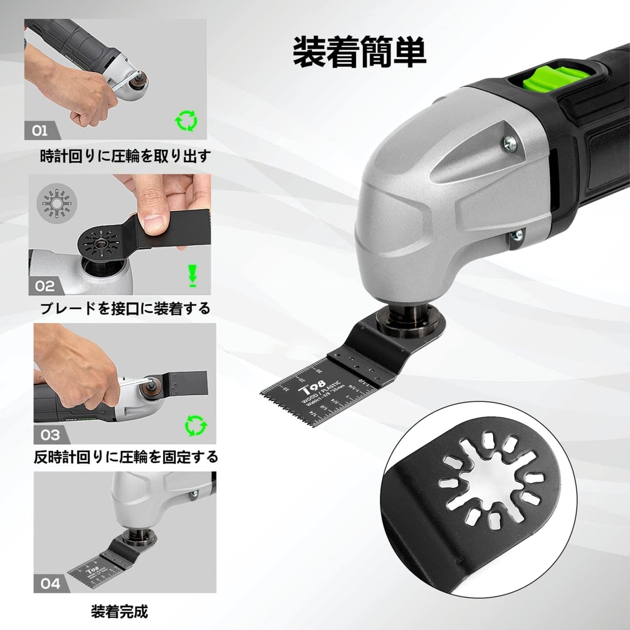 【対応機種】Bosch MultiX、Bosch GOP 250CE、Craftsman Nextec 17438、Craftsman Nextec 61199、Craftsman Nextec 5910、Craftsman 2702 2.0 Amp、Chicago 67256、Chicago 67537、Chicago 67538、Chicago 67707、Chicago 67777777 8303、Fein Multimaster AFMM 14、Fein Multimaster FMM 250 Q、Fein MultiMaster FMM 250 Q-MS,Fein MultiMaster MOX 6-25 、GALAX PRO 220 Volts(AC)、日立、ボッシュ等大部分の機種に対応しています。