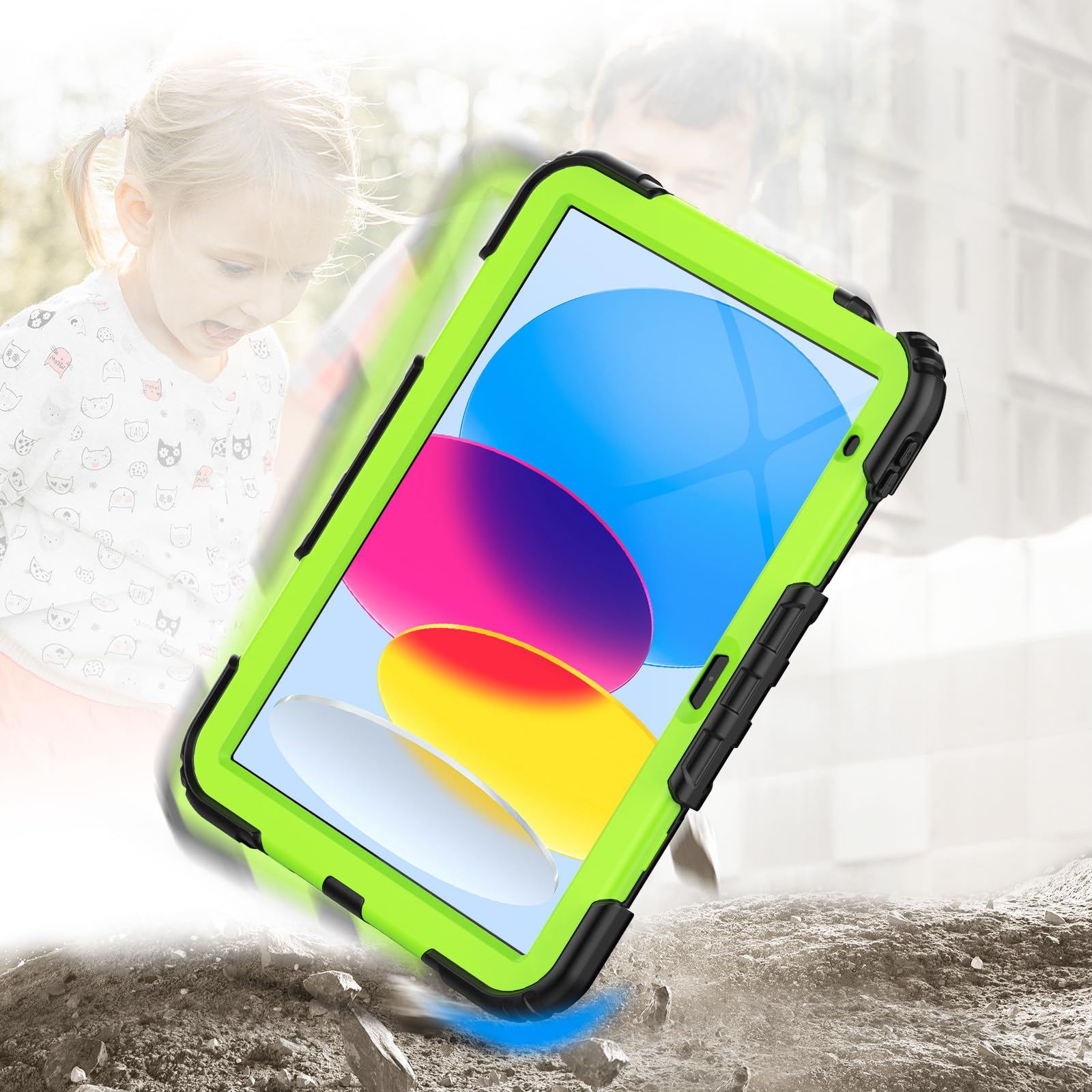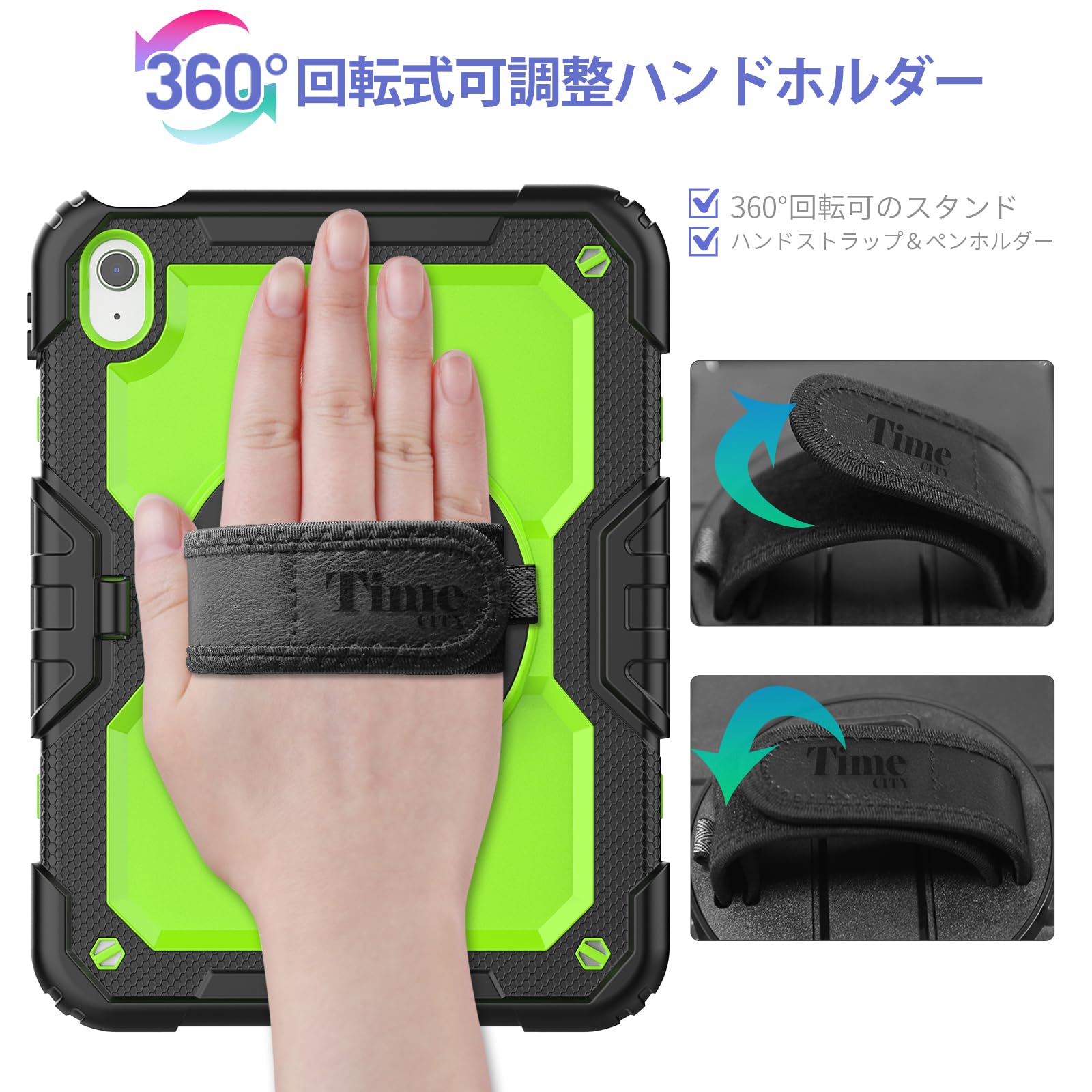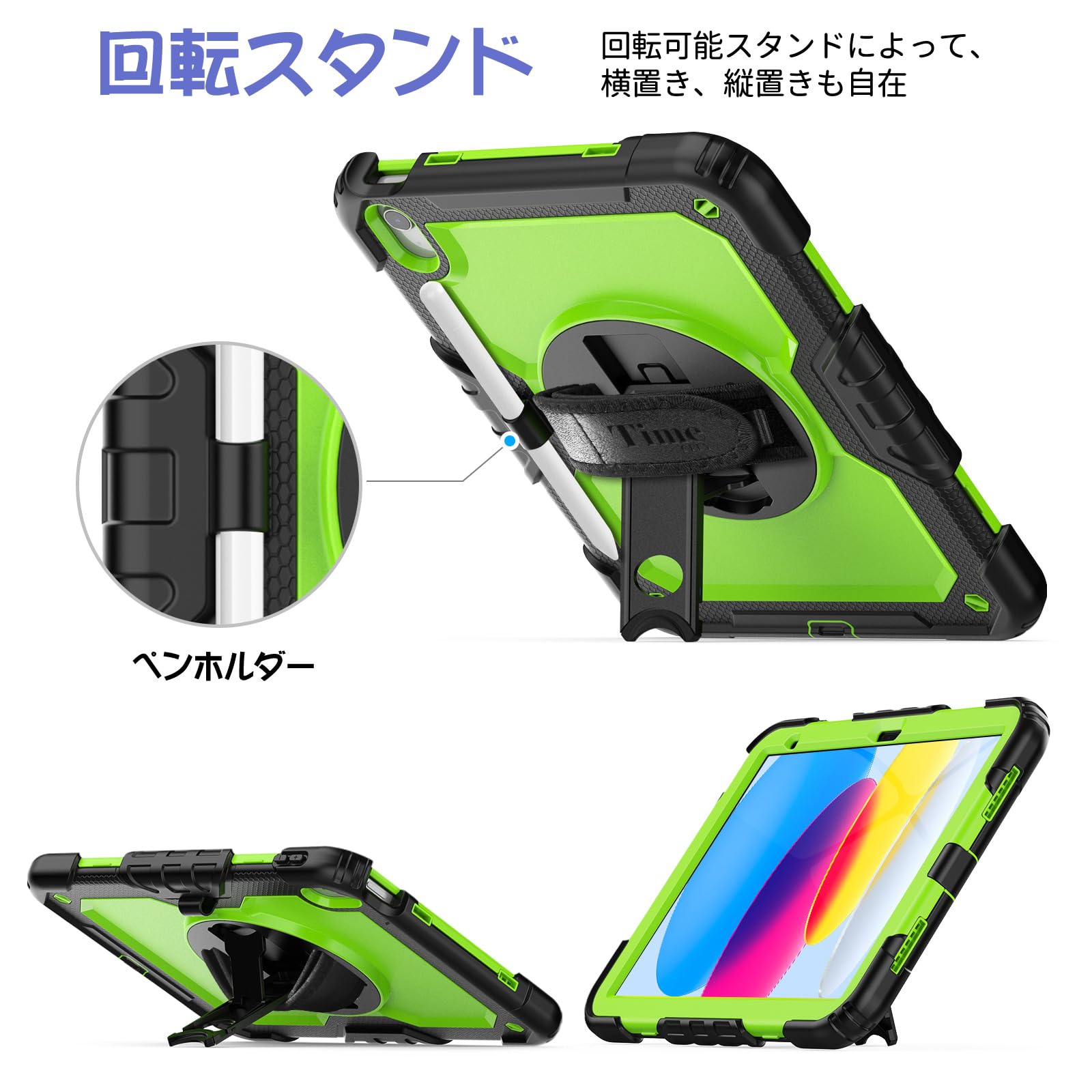 Timecity iPad 第11/10世代 ケース 2025新型 耐衝撃 360回転スタンド ペン収納 保護フィルム付き ハンドストラップ&ショルダーストラップ付き 傷防止 頑丈 子ども 多機能 工事現場 2025/2022 iPad A16 11世代/10世代 ケース (イエローグリーン)