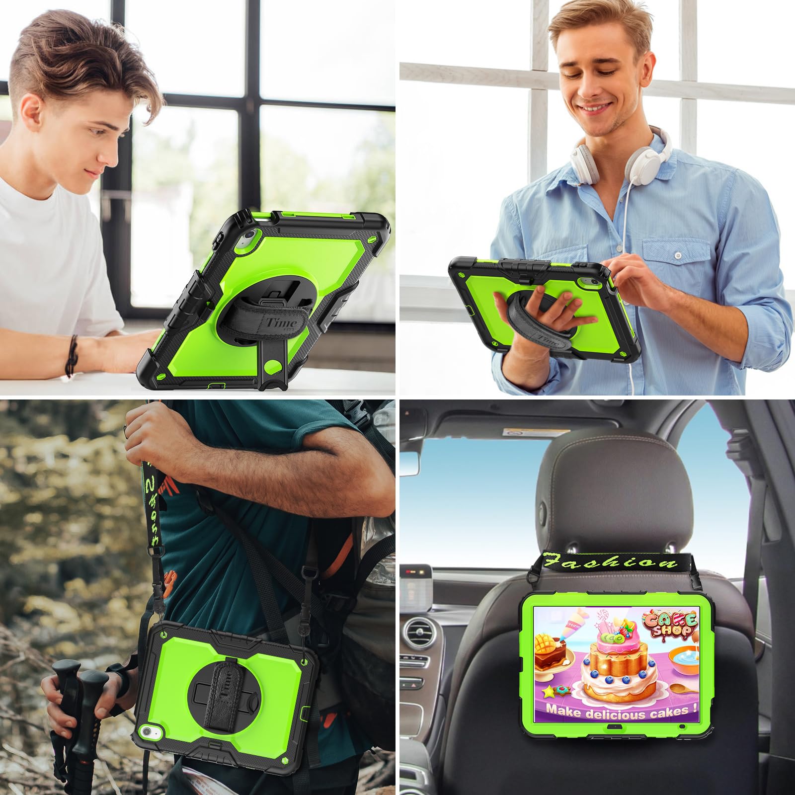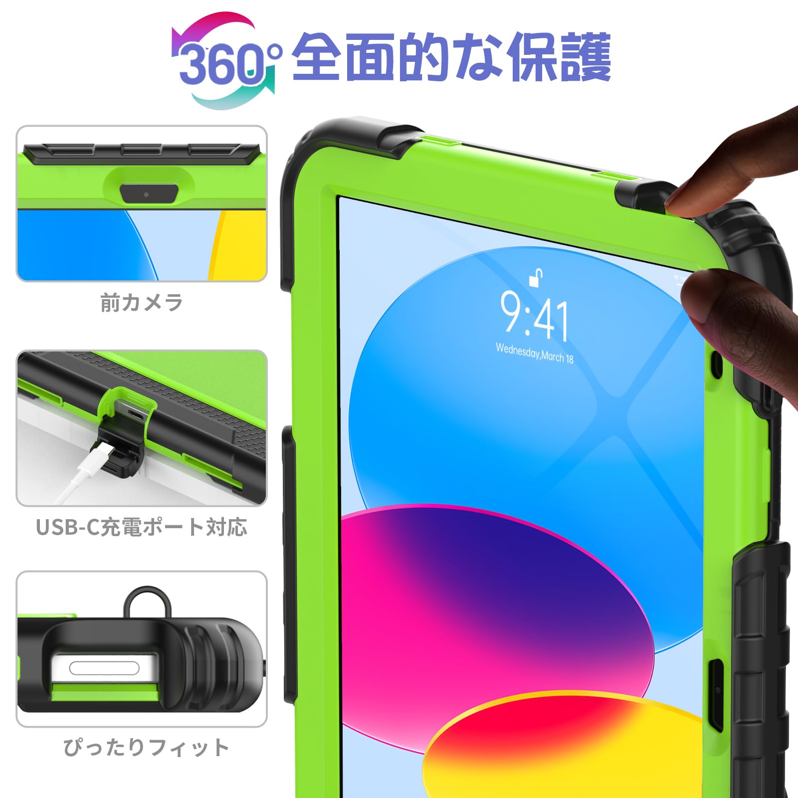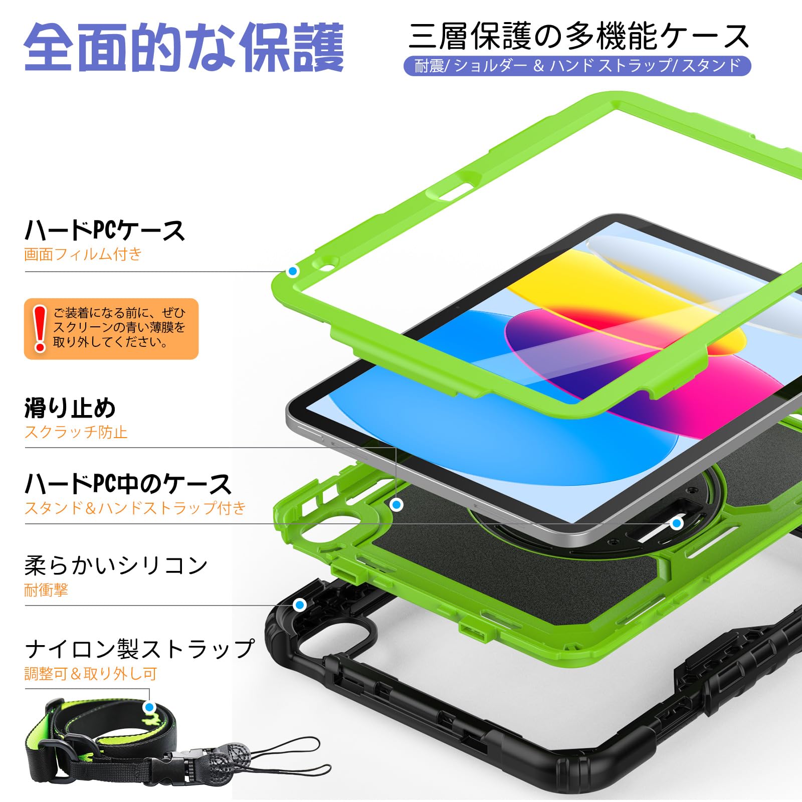 Timecity iPad 第11/10世代 ケース 2025新型 耐衝撃 360回転スタンド ペン収納 保護フィルム付き ハンドストラップ&ショルダーストラップ付き 傷防止 頑丈 子ども 多機能 工事現場 2025/2022 iPad A16 11世代/10世代 ケース (イエローグリーン)