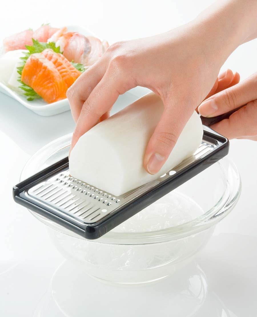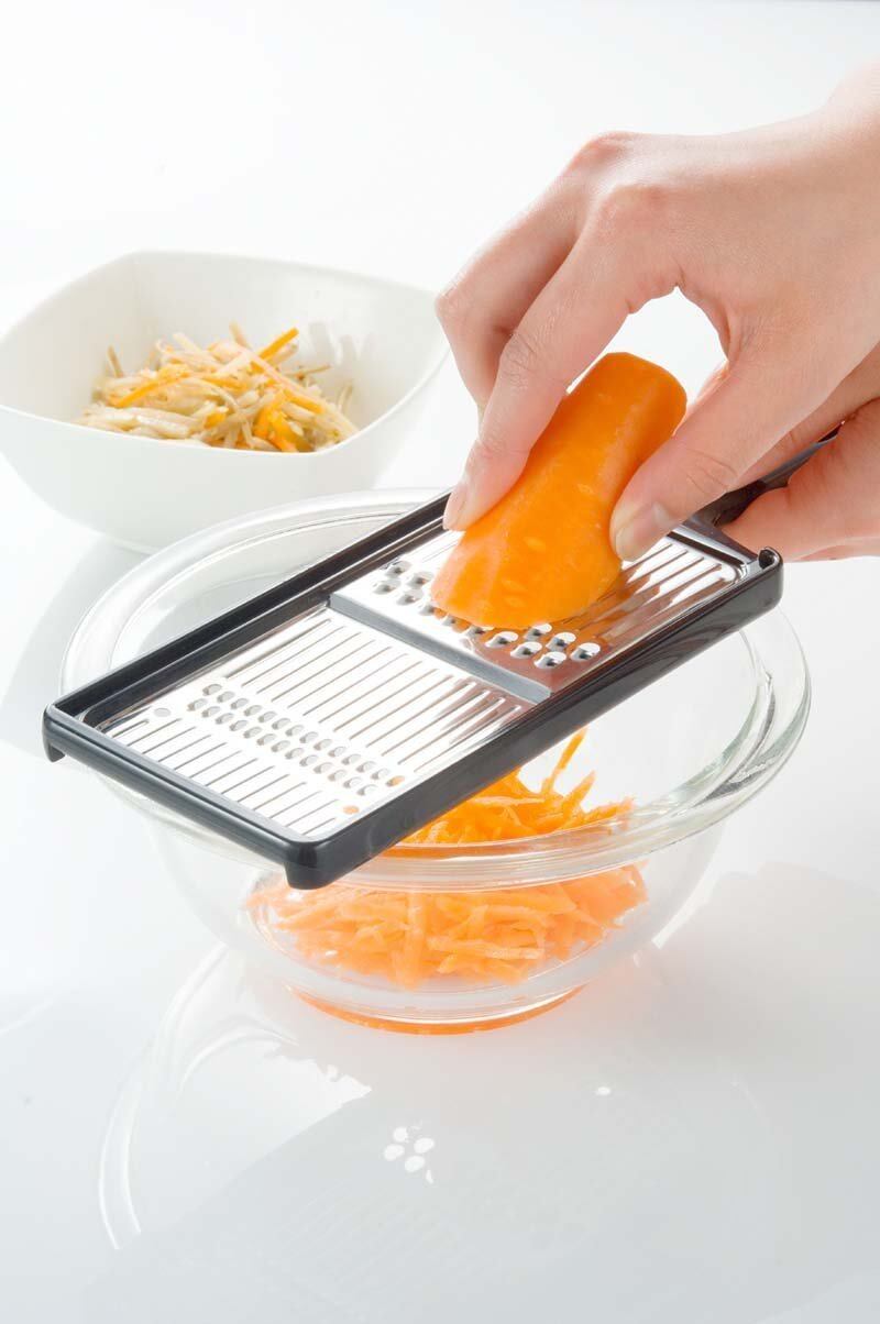 刃は丈夫で衛生的なステンレス製で、両面で千切りとツマ切りの使い分けができます。本体を斜めに立てて、大根・人参などを上から下へ押し削り取るタイプです。サラダやおみそ汁の具に便利。インサート成形なので汚れなども付きにくいです。 品番 32650 材質 金属部:ステンレス鋼樹脂部:ポリプロピレン(耐熱110℃・耐冷-20℃) サイズ 幅8.9×全長25.7×高さ1.2cm 重量 83g 生産国 日本 JANコード 4957423058285
