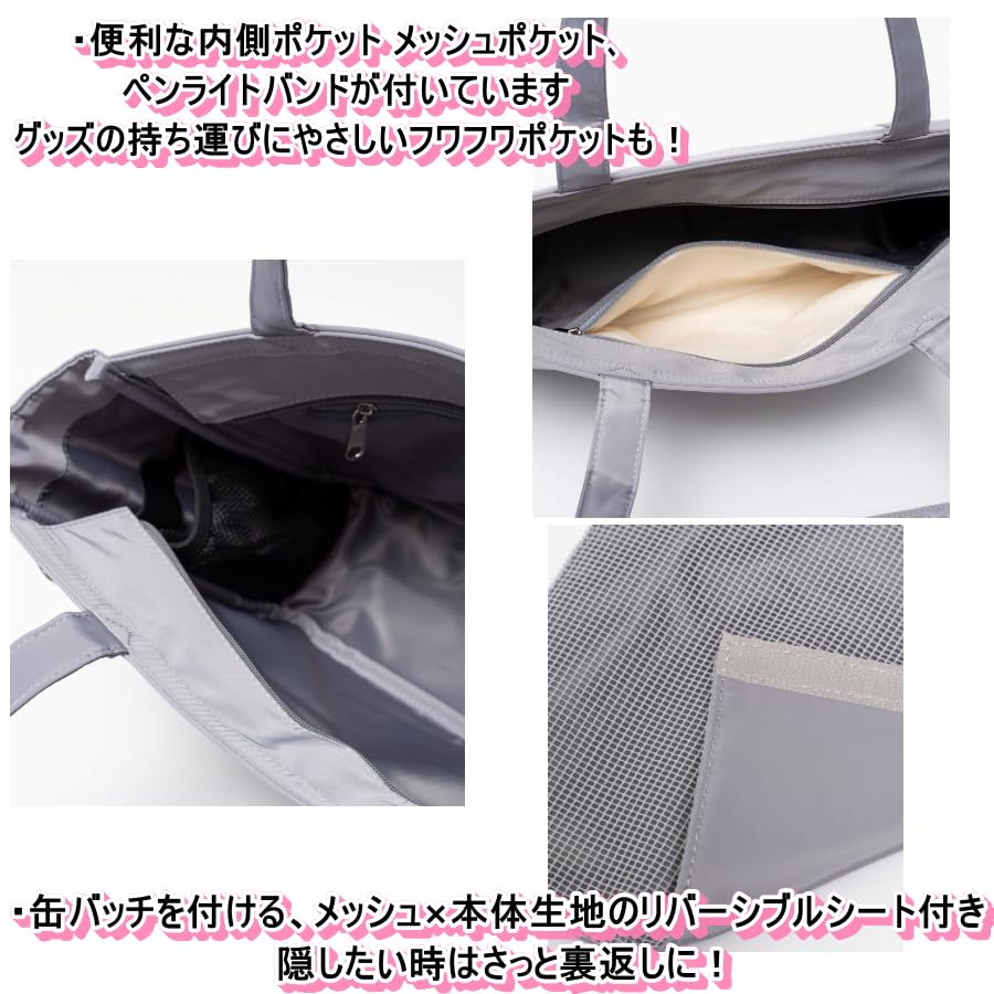 ・ポリエステル素材で汚れにくく軽量です。 ・両サイドのDカンで自由にアレンジ! 別売りの【WG23AW11-G0002 ときめきDIYセットS】と 合わせて、リボン&フリルのデザインバリエーションが楽しめます。 ・缶バッチを付ける、メッシュ×本体生地のリバーシブルシート付きです。 隠したい時はさっと裏返しに! バッグ内側からシートはバッグ内側から出し入れするのでクリア面がキレイに見えます。 ・便利な内側ポケット メッシュポケット、ペンライトバンドが付いています。 グッズの持ち運びにやさしいフワフワポケットも! ・底面汚れを軽減する底鋲付きです。
