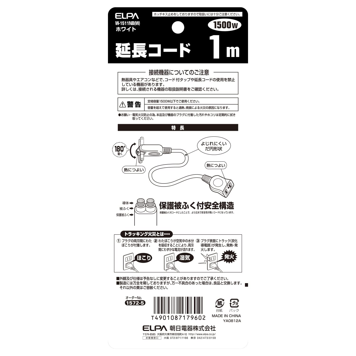 エルパ(ELPA) 延長コード コンセント 1m 1個口 125V 15A 耐トラッキングカバー メス-オス W-1511NB(W) ホワイト