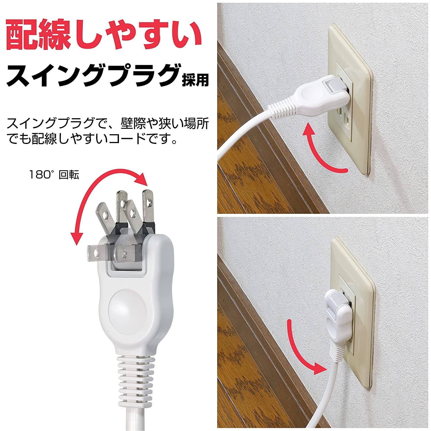【スッキリ配線】180°スイングプラグ は狭い場所でも壁にピッタリ。