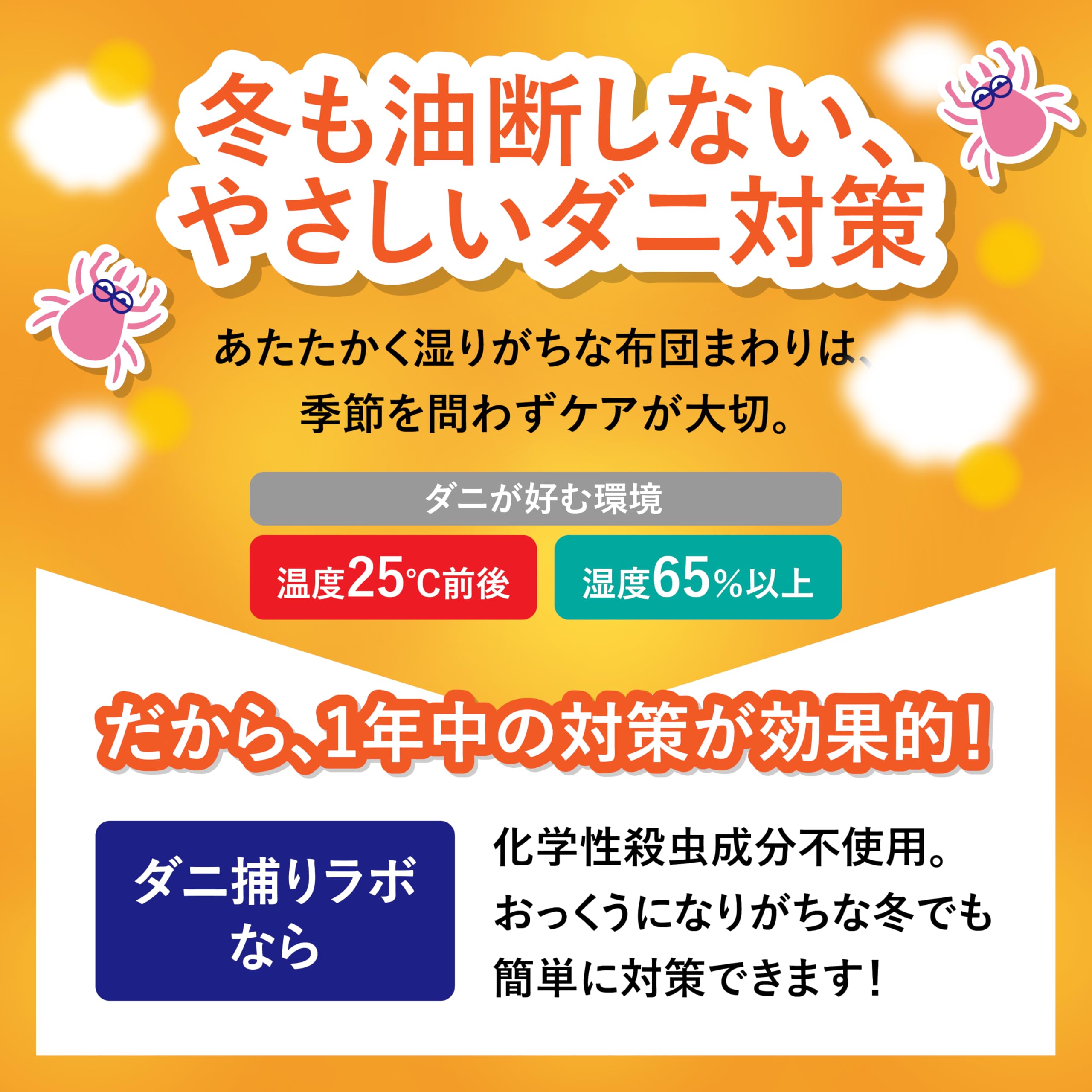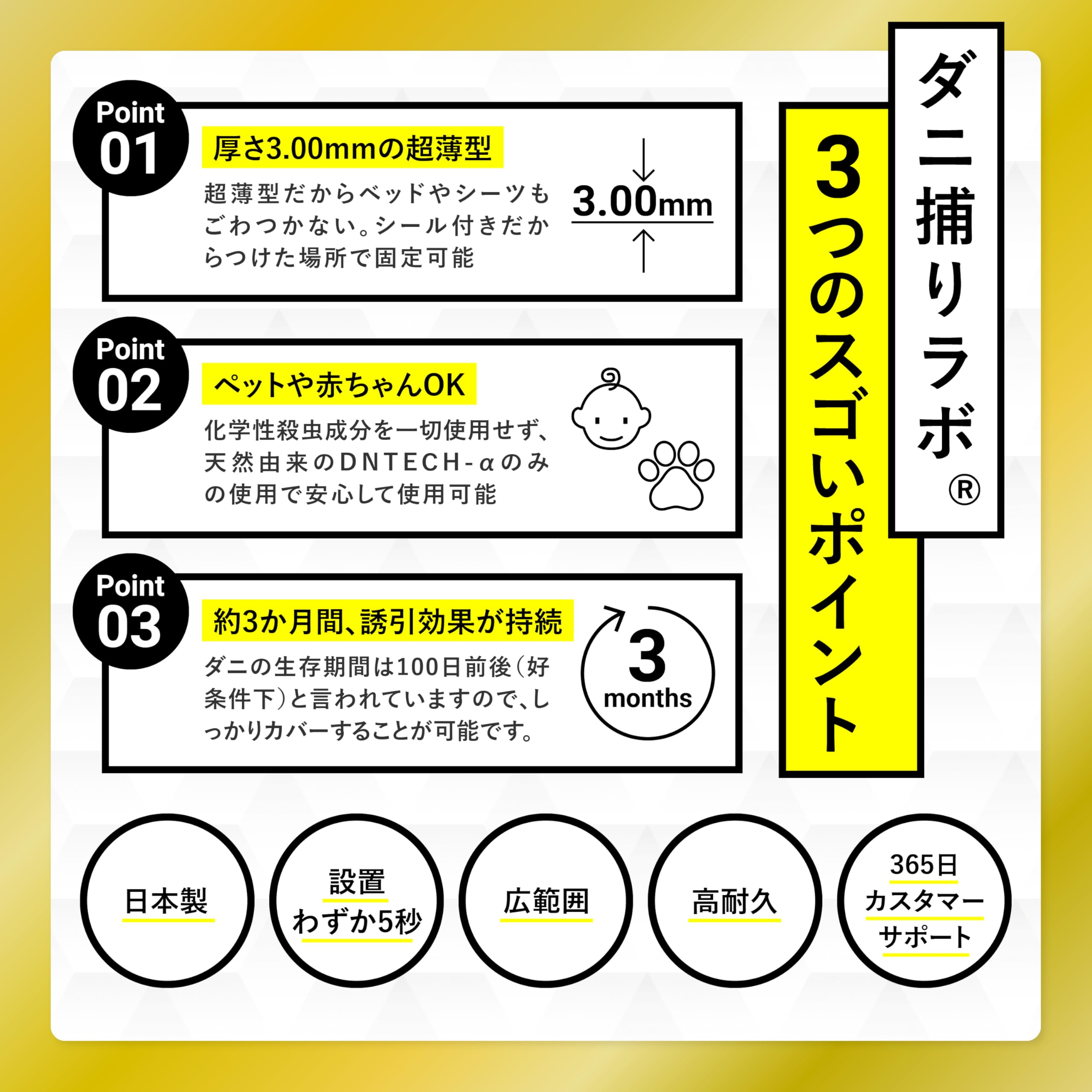 ?従来にはなかった乾燥タイプのダニ捕りシートが新登場!20年以上の歴史がある衛生管理製品開発開発。独自開発のDNTECH-αと特許出願中のnano-DRY-Dを最大量配合させることで、ダニ捕りシートにダニを大量に誘きよせて一網打尽に。置くだけの乾燥タイプが、水分を多く持つダニに対してより効果的に働きます。化学性殺虫成分を一切利用していないので、子供やペットにも安心安全です。