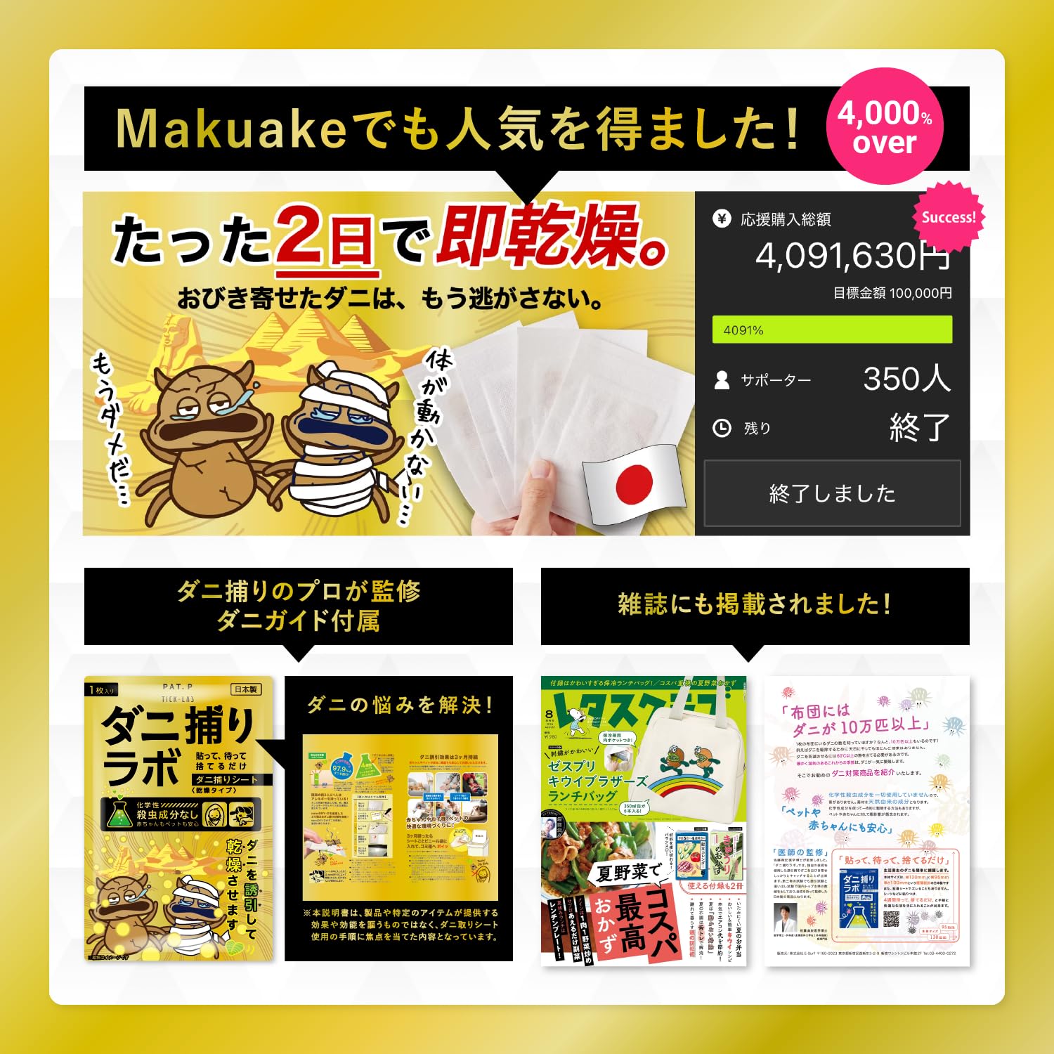?独自成分のnano-DRY-Dが、ダニを二日で即乾燥。これまでのダニ捕りシートはダニを捕えてもダニが活動し続けることで排泄物や卵を産み、それらが外に出てしまったことも。しかし、乾燥タイプのダニ捕りラボは、80%以上が水分で含まれているダニを乾燥させることで2日で急速に弱体化させます。