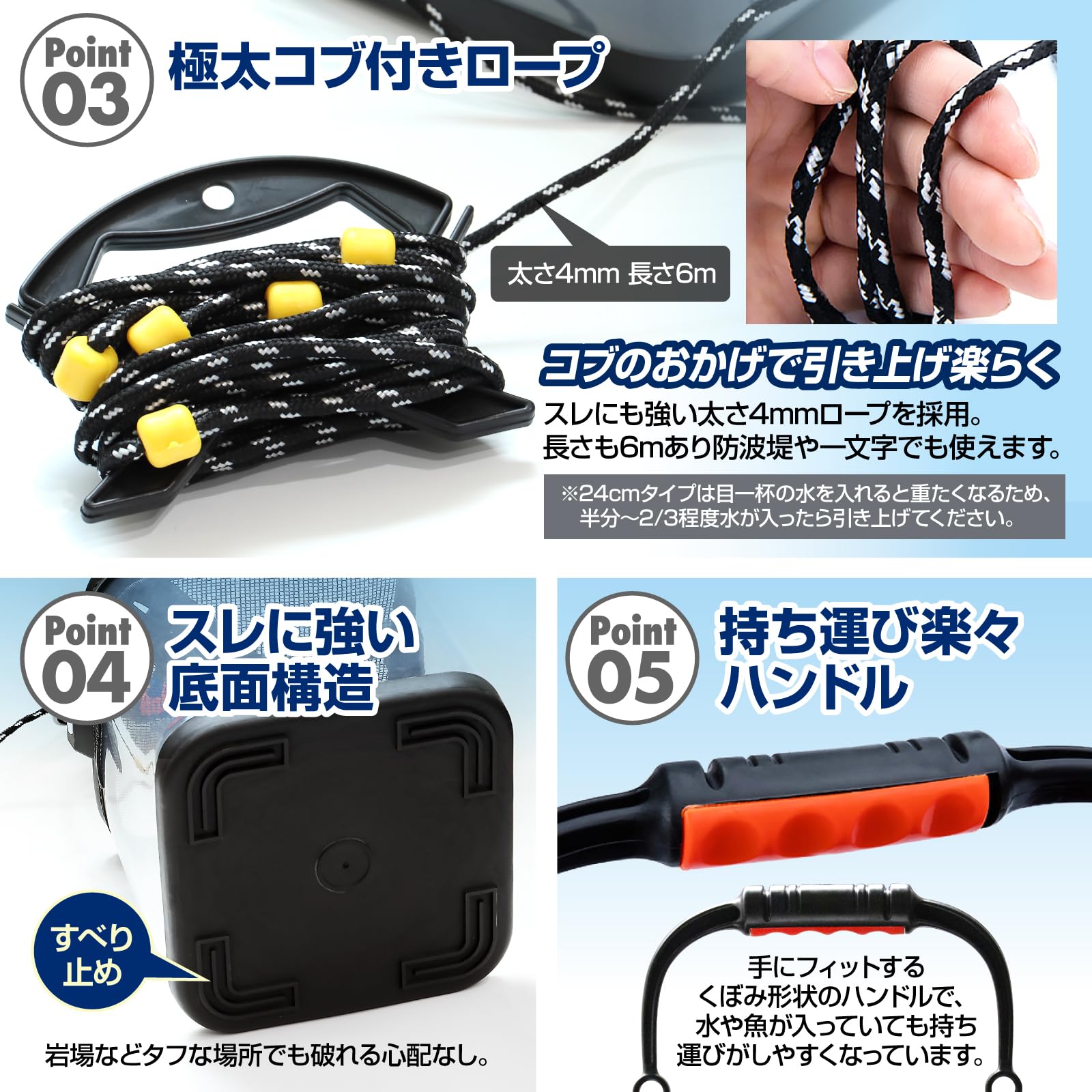?【高耐久コブ付き ロープ 】 従来より1.3倍太くした直径4mm, 長さ6mロープを採用。たぐり寄せやすいコブも付いており、水の汲み上げ作業をサポートします。防波堤や一文字でも使用可能です。