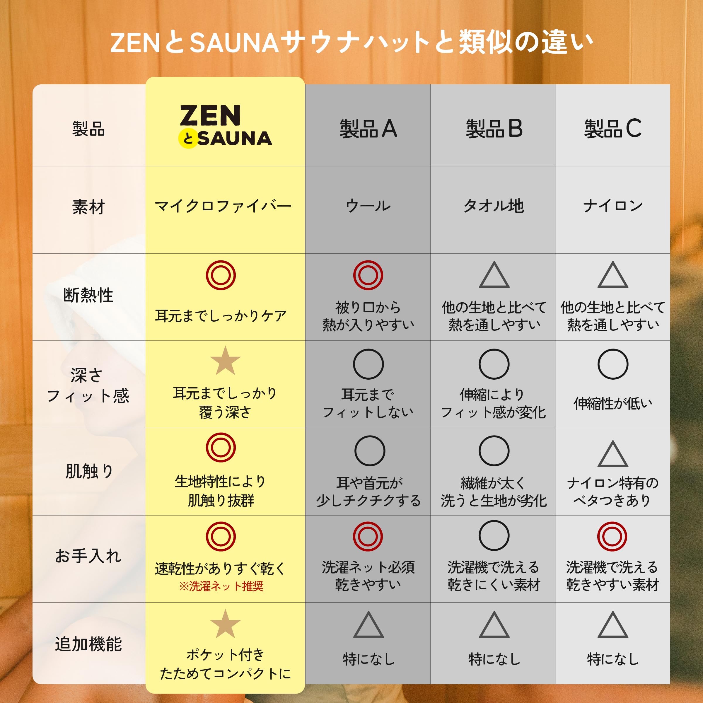【ZENとSasuna サウナハット】 キャンプブランドZEN Campsのサウナ好きのスタッフとサウナスパアドバイザーが究極の「ととのう」を追求して開発したサウナハットです。 マイクロファイバー生地は柔らかい&糸がほつれにくい生地で肌触り抜群。耳や首元に触れても心地良く、サウナに没頭できます。伸縮性が高くフィット感があり、髪を結んでいても被れます。タオル生地よりも吸収力、速乾性が共に高く汗が顔に落ちるのも軽減。洗濯も簡単です。のぼせ防止・髪や頭皮へのダメージ軽減に最適。邪魔になりがちなロッカーの鍵や小物を収納できるポケット付きで便利に使うことができます。