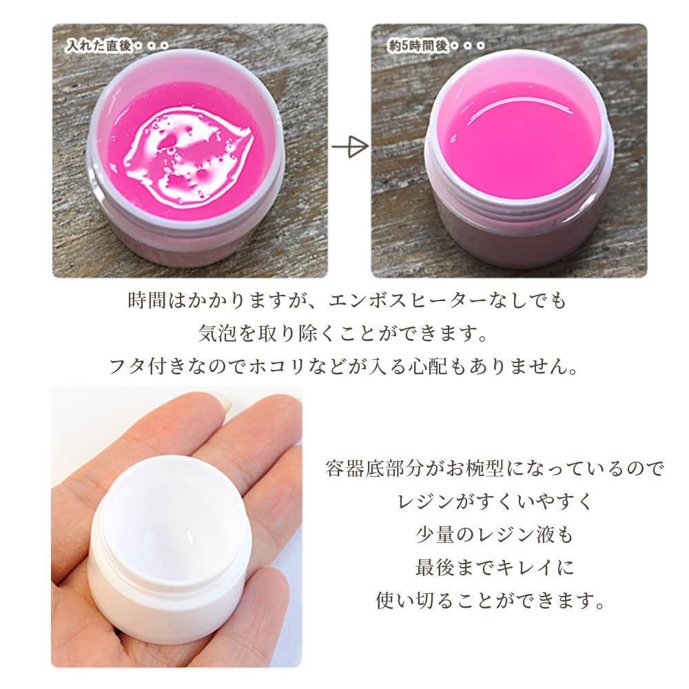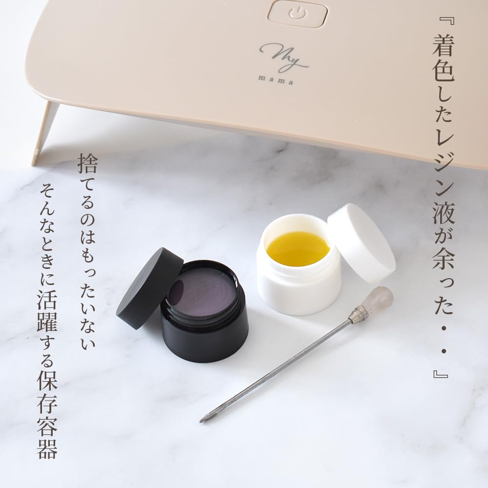 「着色したレジン液が余った・・・」なんてことありませんか?そんな時、活躍するのがこの保存容器です。使い方はとっても簡単、余ったレジン液を入れるだけ。容器の底部分がお椀型になっているので、レジン液がすくいやすく最後までキレイに使い切ることができます。ふた付きなのでホコリが入る心配もありません。お気に入りのカラーの作り置きにもおすすめです。レジン液だけでなく、ジェルネイル液の保管にもお使いいただけます。