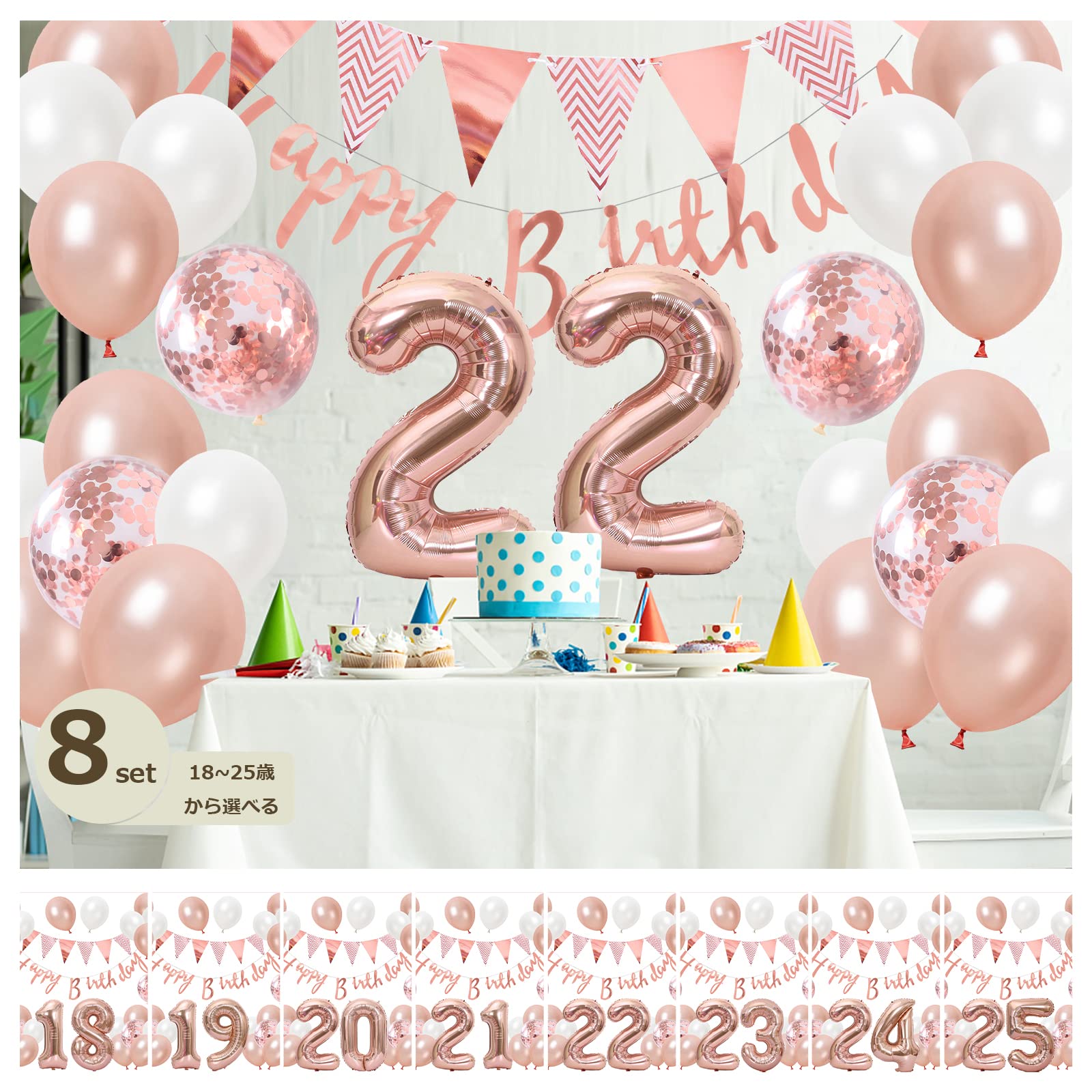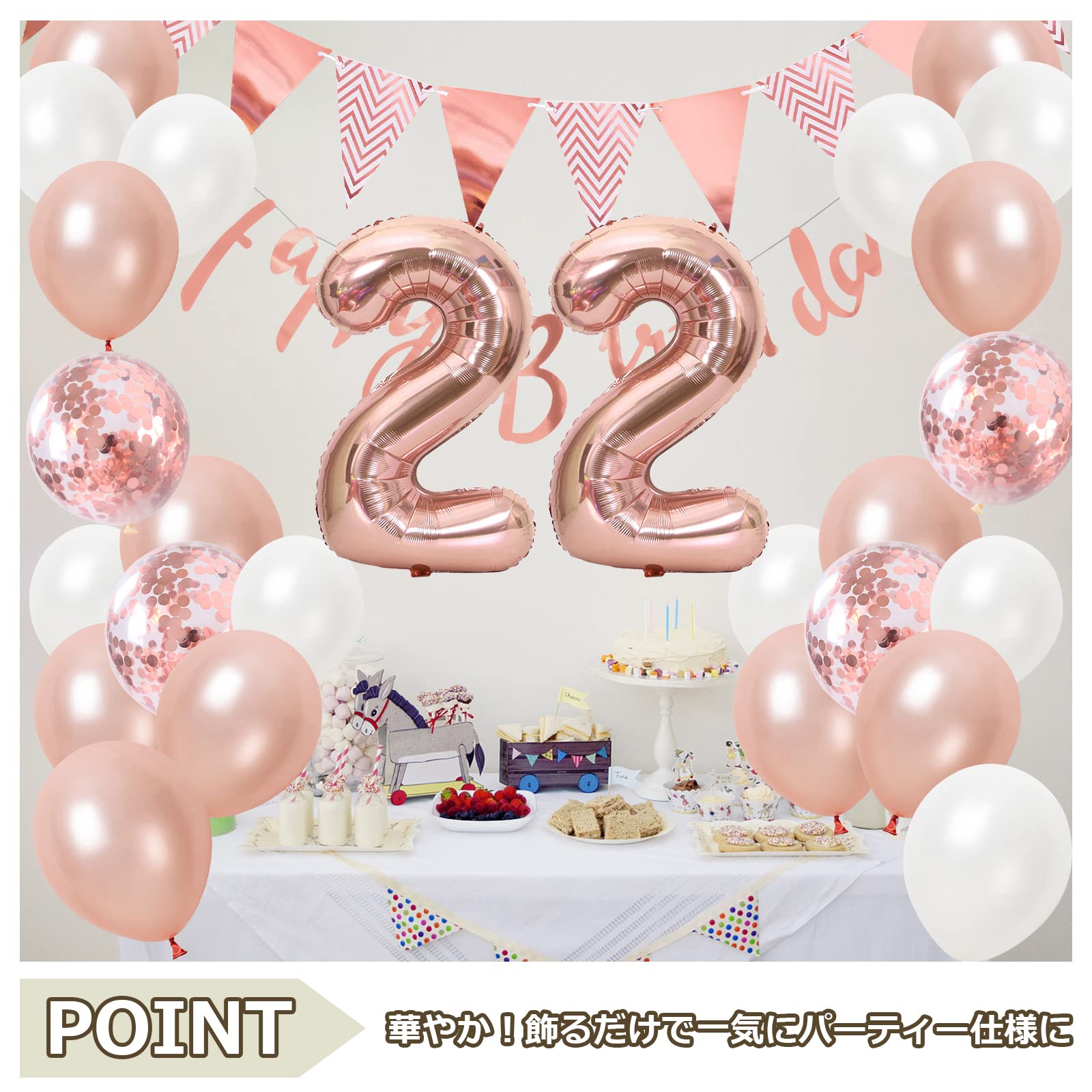 〔豪華なセット内容〕「22」数字バルーン×各1個、フラッグガーランド×1本、HAPPY BIRTHDAYガーランド×1本、紙吹雪入りバルーン×5個、ホワイトバルーン×10個、ローズピンクバルーン×10個、おまけ:リボン×1個、ドットシール×1枚。※商品の取り扱いは6才以上のお子様にお勧めします。ガーランドはお客様自身で糸通しをお願い致します。バルーン類は全て空気の入ってない状態でのお届けです。お届け後ご自身で膨らませてご使用下さい。
