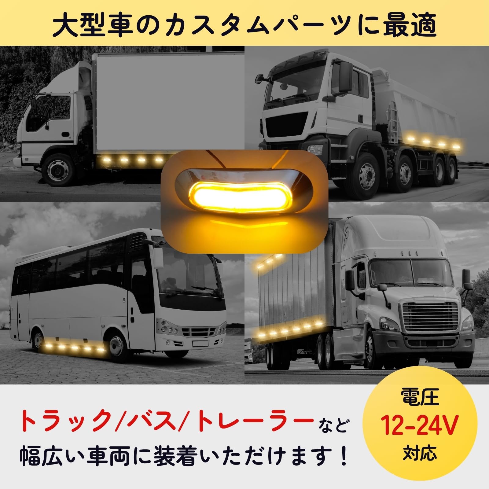 【走行の安全性を劇的向上!防水性能で全天候対応】長距離運転や夜間の走行では、視認性の低下が事故のリスクを高めます。この「サイドマーカーLED 4連」は、高輝度LEDを4連搭載し、遠くからでもはっきりと視認可能。鮮やかな発光で、他車や歩行者に存在を強くアピールし、接触事故のリスクを低減します。さらに12V・24V両対応で、トラック・大型車・軽自動車・キャンピングカーまで幅広く装着可能。夜間や悪天候時でも、自車の位置を正確に知らせることで、安全で快適なドライブを実現します。日常的に過酷な環境を走るトラックや作業車にとって、耐久性は必須。このLEDマーカーは防水仕様(IP67相当)で、雨天や降雪、泥跳ねの中でも安定した発光を維持します。結露や水没による点灯不良の心配がなく、長期間安心して使用可能。輸送業や建設現場など、常に車を稼働させるプロフェッショナルドライバーの心強い味方です。