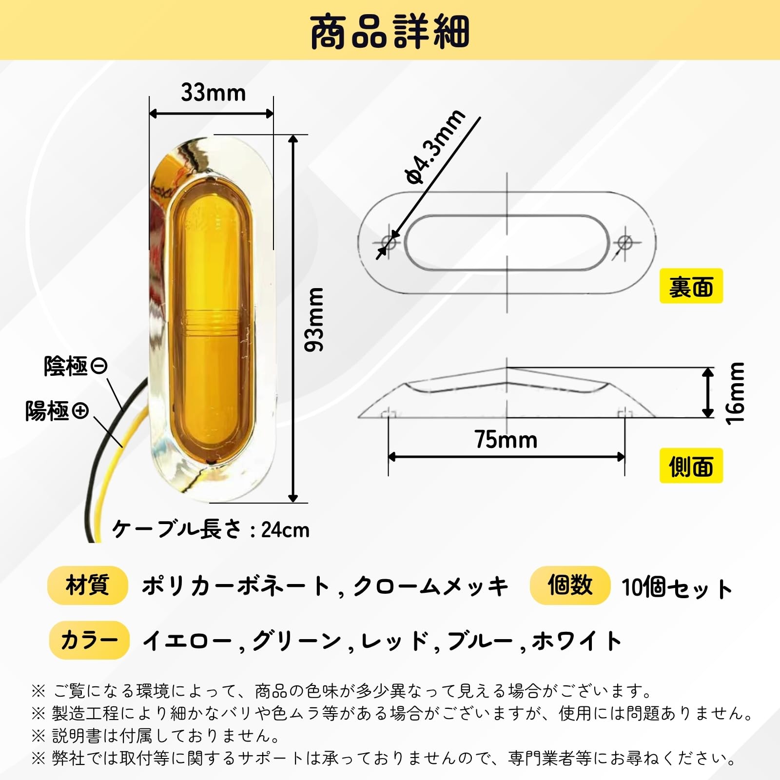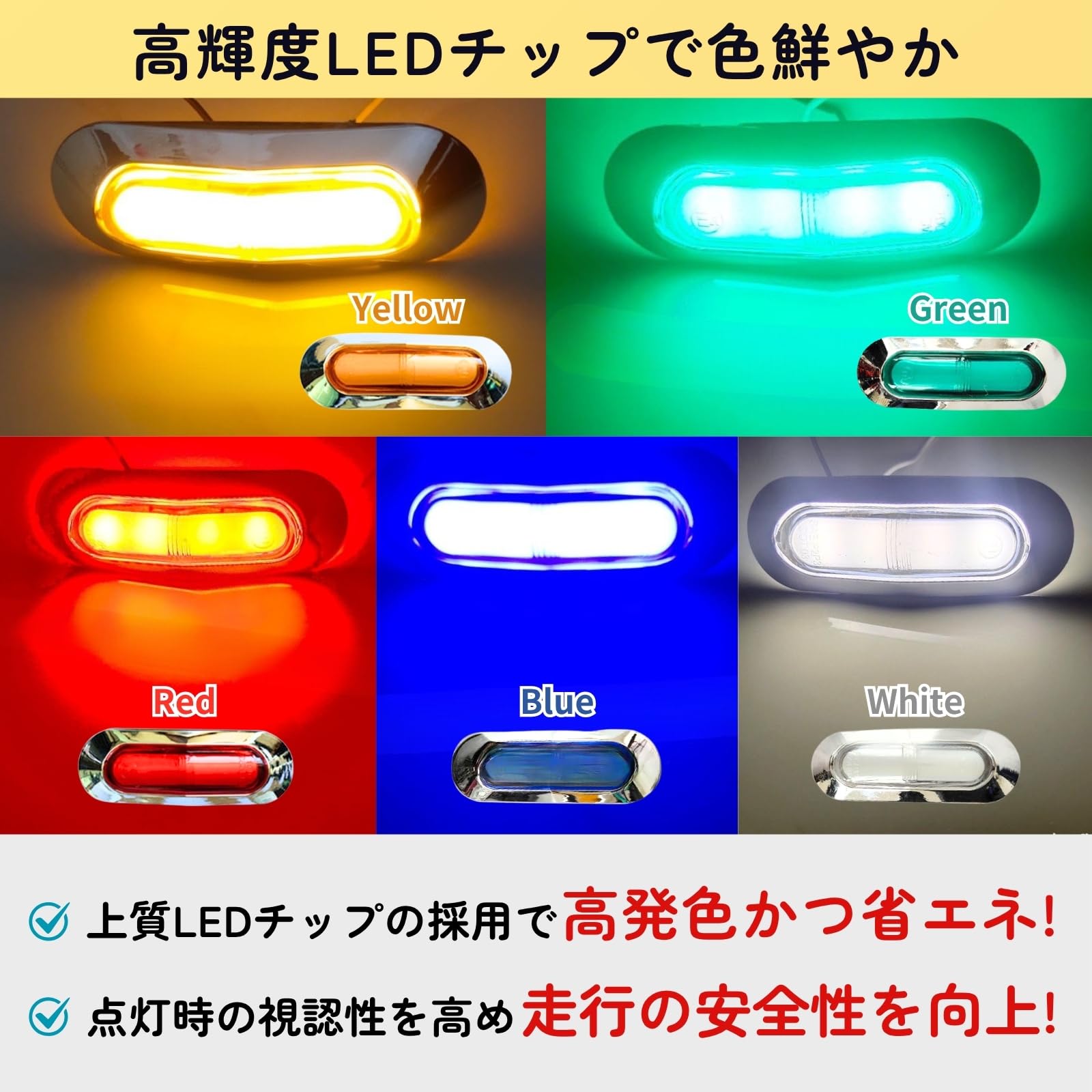 【商品内容】サイズ:9.3cm×3.3cm、配線長さ約24cm(1個当たり) 【カラー】 レッド、イエロー/アンバー、ブルー、グリーン、ホワイト 【注意事項】 ・の商品につきましては、30日間の返品・がついてございます。1つ1つ丁寧に検品しておりますが、万が一商品の初期不良・不具合や破損等ございました際には、大変お手数ではございますがカスタマーサポートよりお問い合わせくださいませ。 ・コスト抑えお客様にお安く提供するため折りたたみ梱包でお届けします。たたみシワにつきましては時間の経過とともになくなりますのでご安心くださいませ。 ・ご覧のモニター環境により実物と色味が異なって見える場合がございます。 ・取扱説明書は付属しておりません。 ・取付方法や適合の可否のサポートついてはでは承っておりません。 ・海外製品のため製造工程でのわずかな色ムラ等が見られる場合がございます。