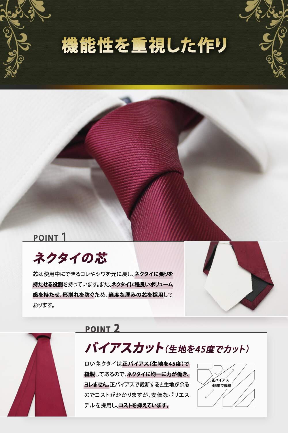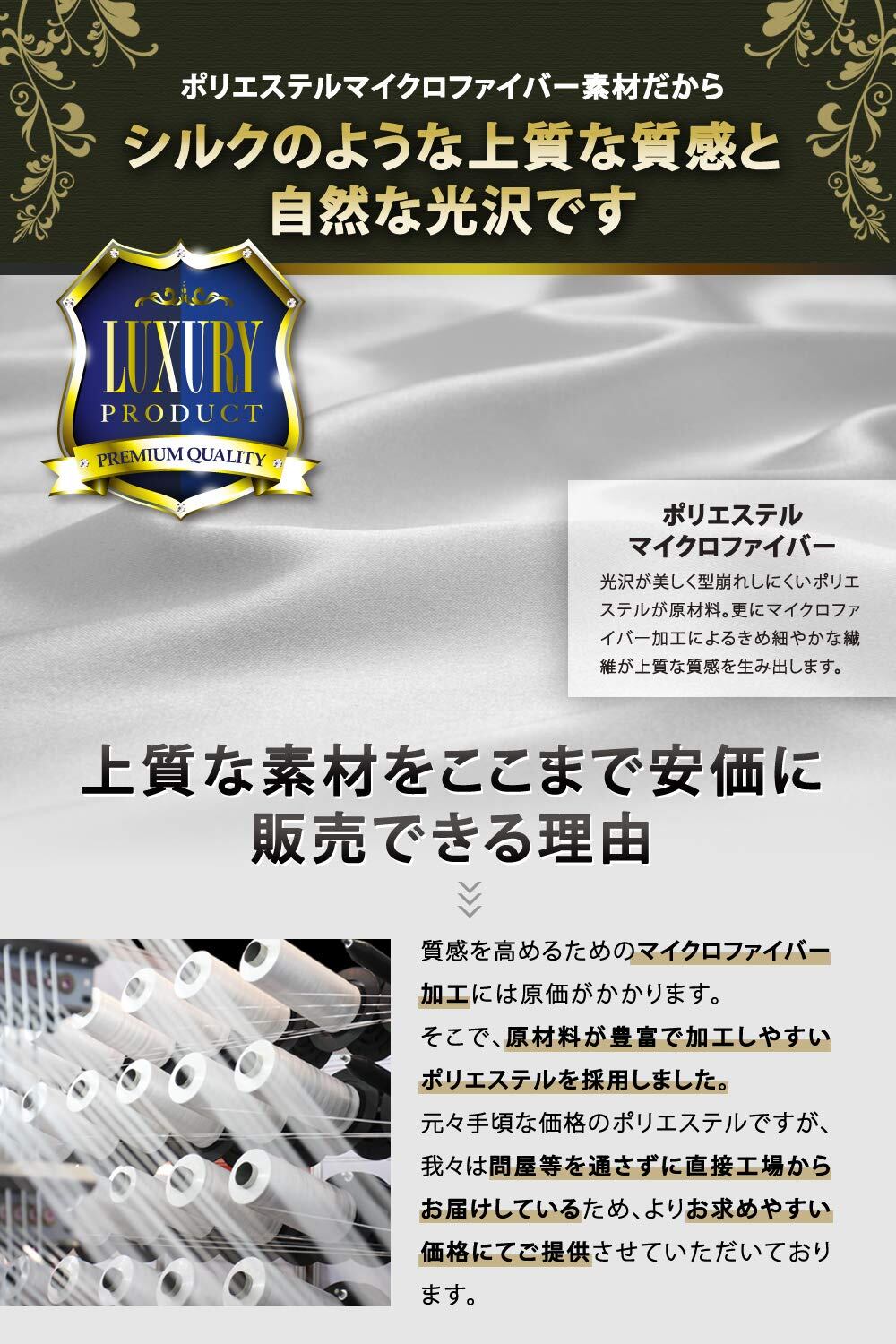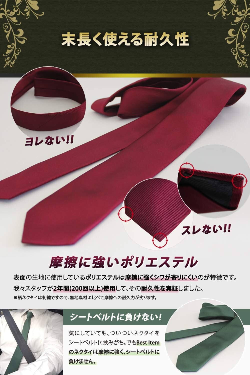 ポリエステルは見た目がシルクに似て、高級感のある光沢が特徴的です。またシワや擦れに強いので使い勝手が良いです。2年間着用した本製品の耐久力を写真で掲載しておりますので是非ご覧下さい。