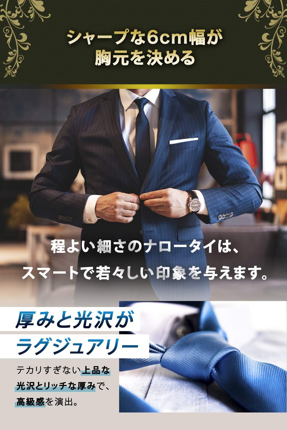 ナロータイは細ネクタイやスリムタイとも呼ばれ、ボディラインをシャープに見せる効果があります。ビジネススタイルには適度なお洒落感を、ファッションには遊び心を演出します。