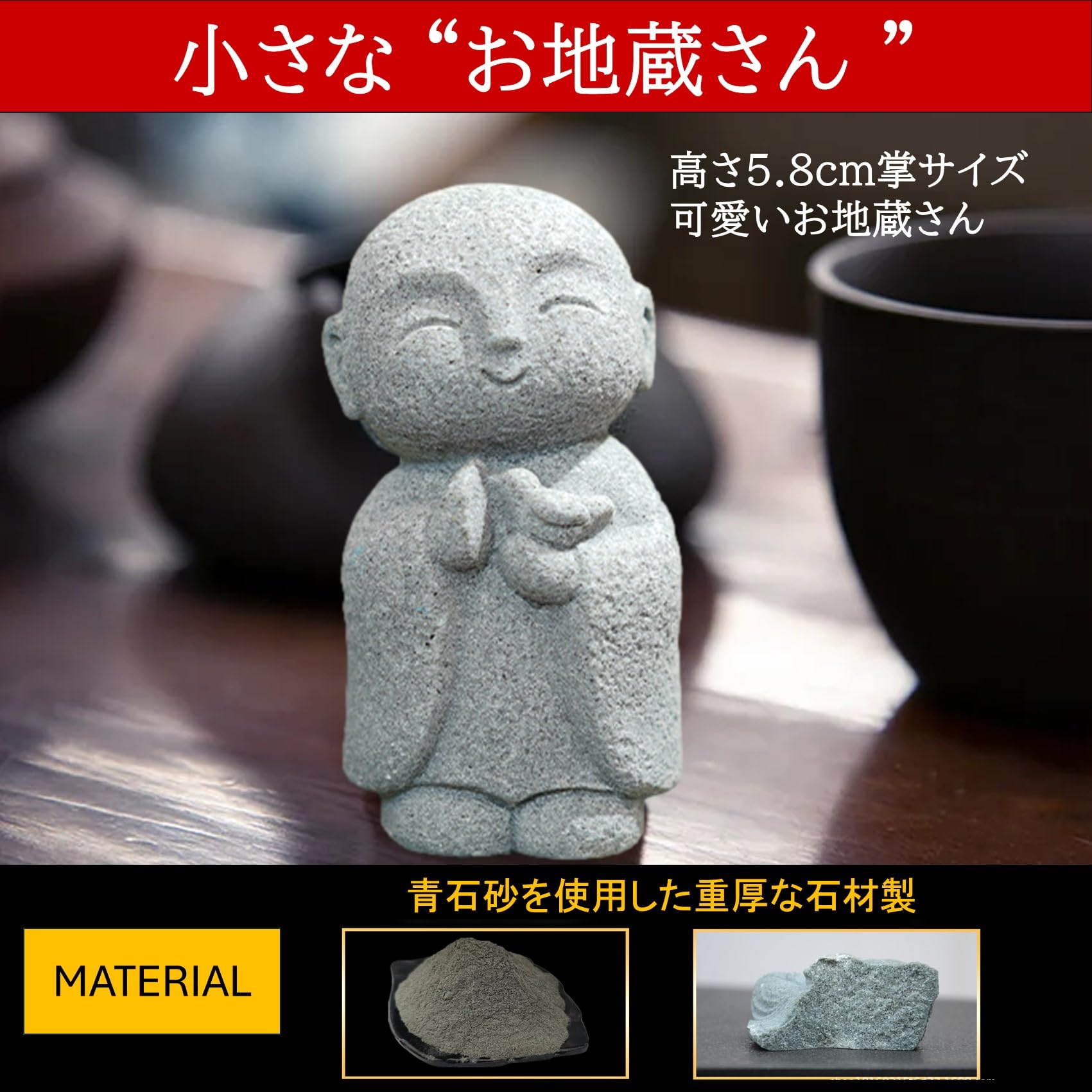 小さく可愛いお地蔵さんの置き物です。高さ5.8cm掌サイズ。青石砂を使用した重厚な石材製で、お部屋のオーナメントやガーデンオーナメント、アクアリウムにも適しています。