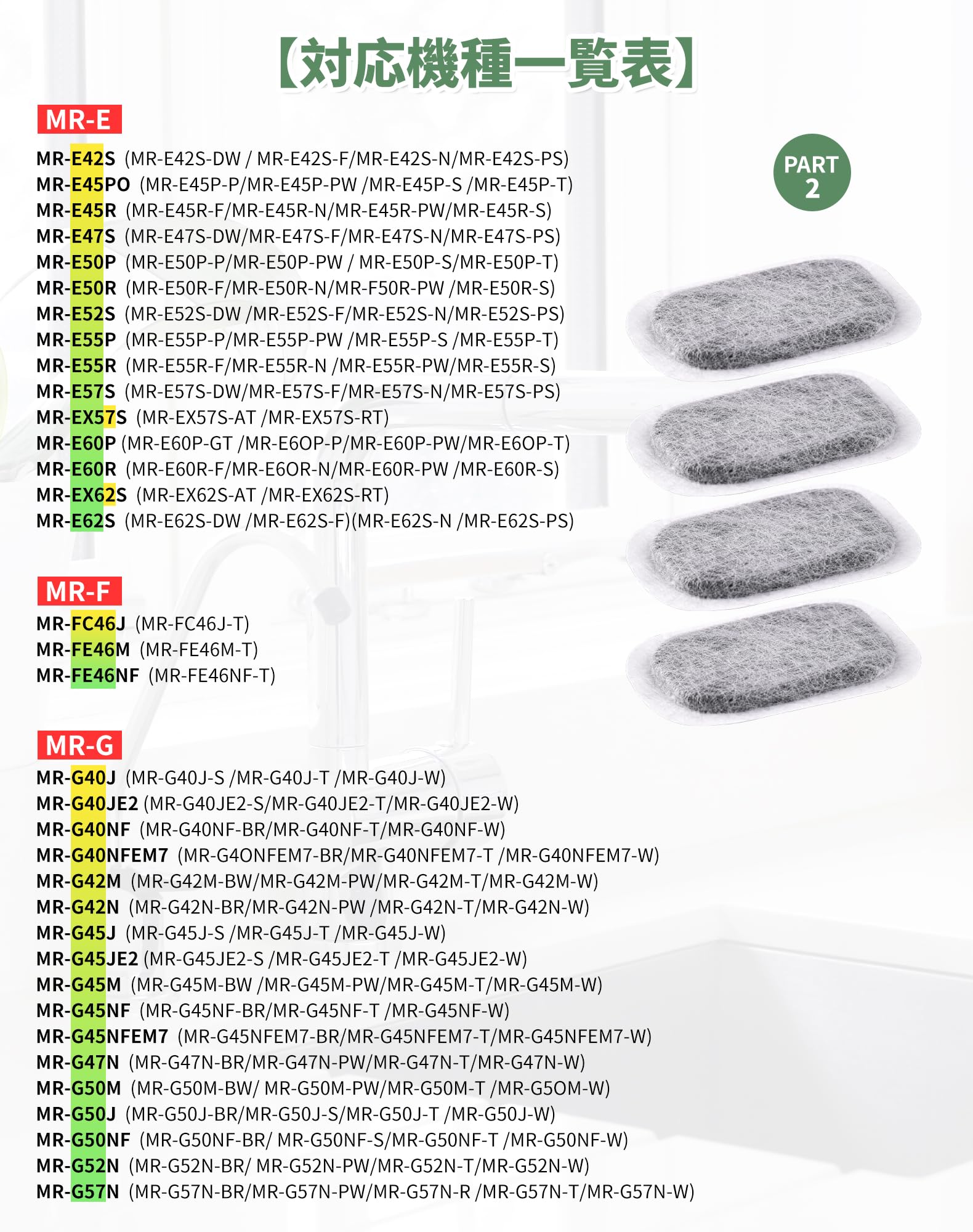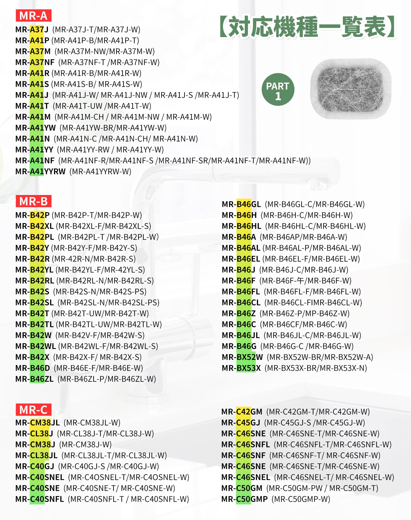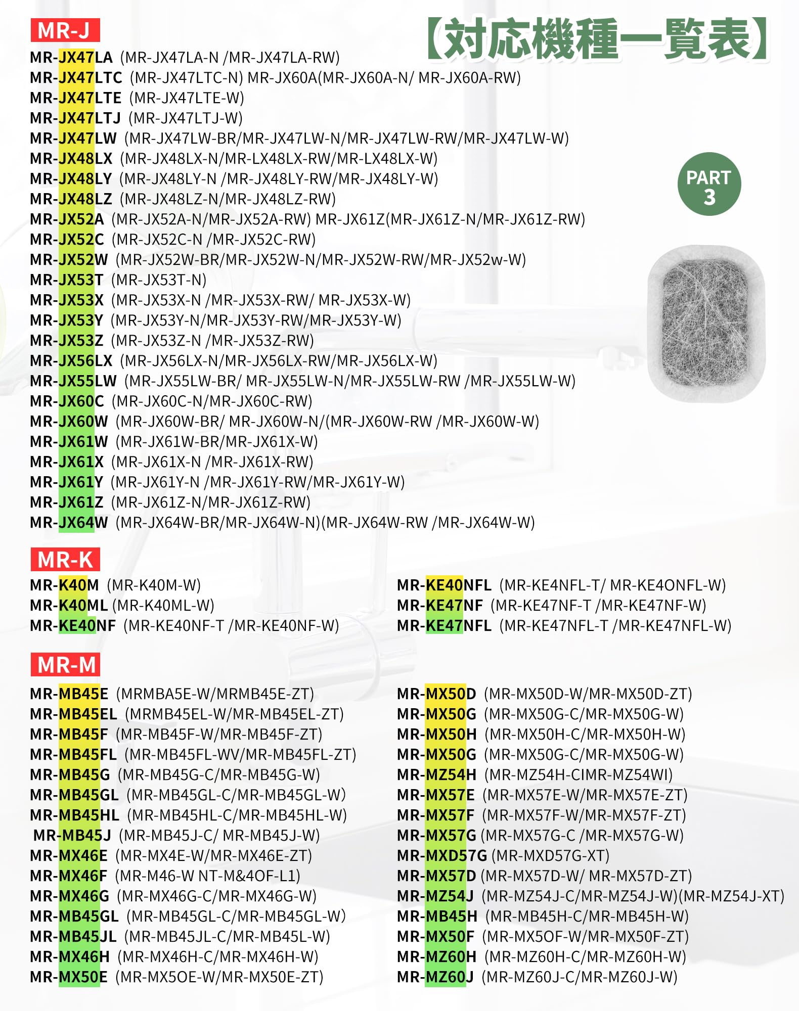 【対応機種】 MRPR-01FT MR-JX52W M20VJ5526 MR-JX53Z MR-JX61Y M20KW0526 M20KWO526 MR-JX60W MR-MB45E MR-WX47C MR-WX71Z MR-B46D MR-RX47T MR-RX52T MR-WX60A MR-MX50F MR-MX57D MR-B46A MR-R47W MR-WX47D M20CM5526 MR-A37JT MR-A37M MR-A37NF MR-A41J MR-A41JS MR-A41M MR-A41N MR-A41NF MR-A41NFS MR-A41R MR-A41SB MR-A41T MR-A41YW MR-A41YY MR-B42T などに対応できる三菱冷蔵庫 製氷機フィルターです。(ほとんどの三菱冷蔵庫製氷機に対応できすが、具体的な機種は写真と商品の説明を参考至てください。